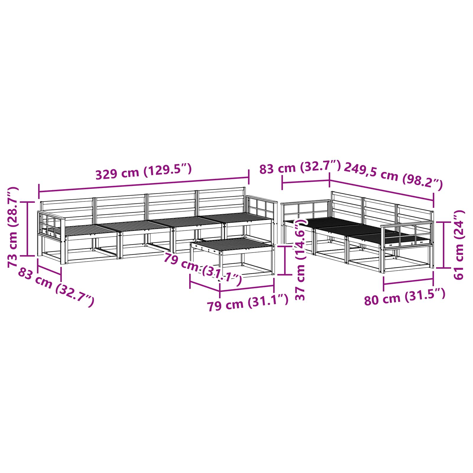 - 7 x srednji kavč: 79 x 83 x 73 cm (D x Š x V)