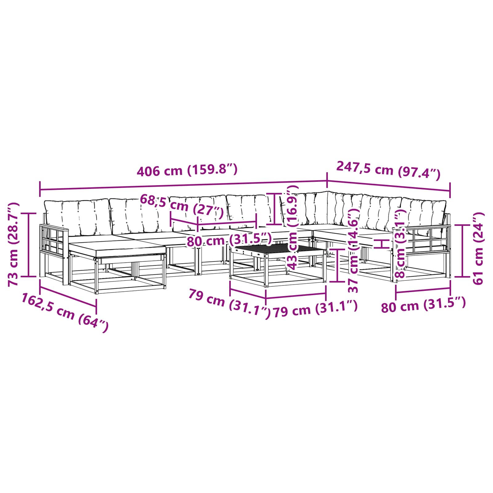- 6 x Srednji kavč: 79 x 83 x 73 cm (D x Š x V)
