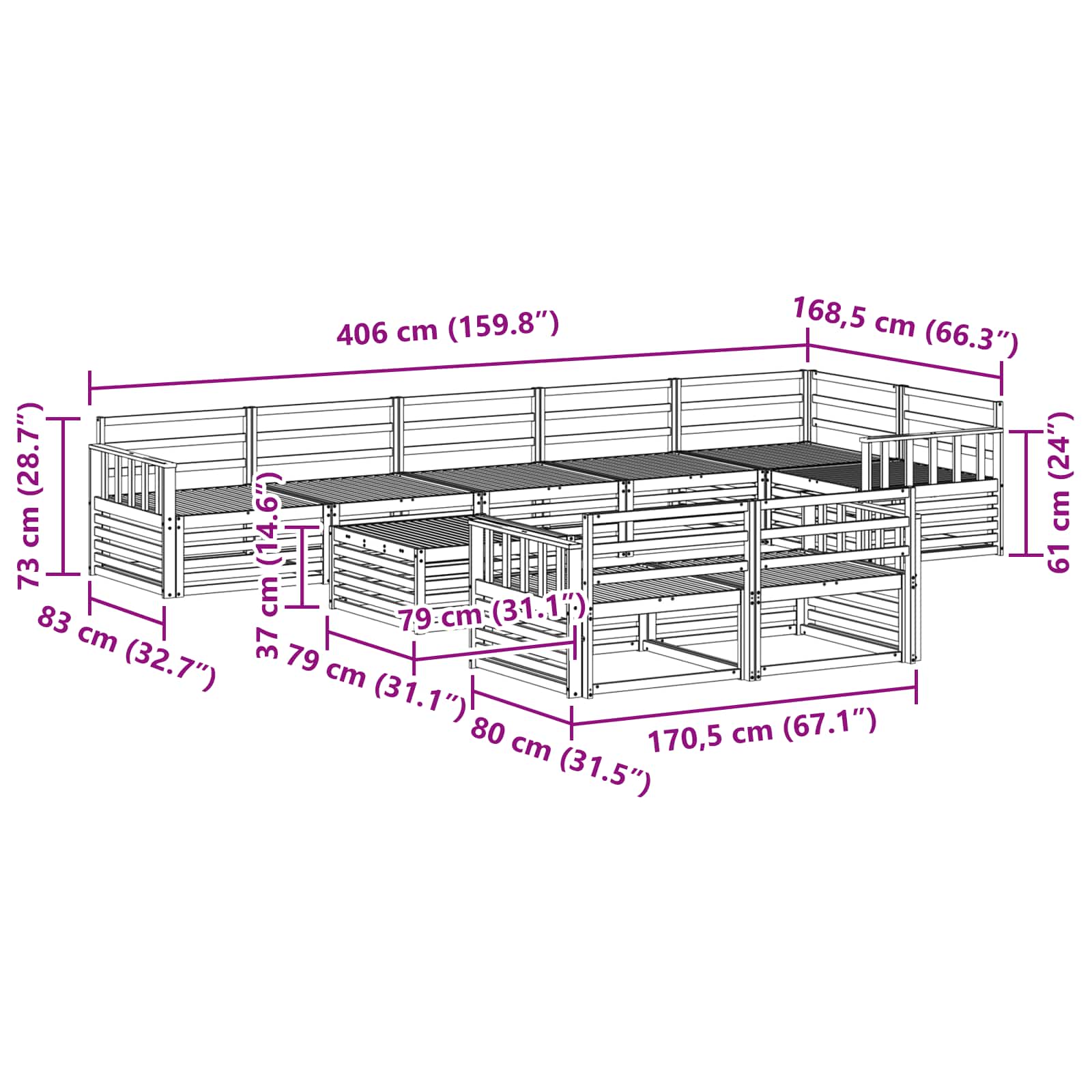 - 7 x Srednji kavč: 79 x 83 x 73 cm (D x Š x V)