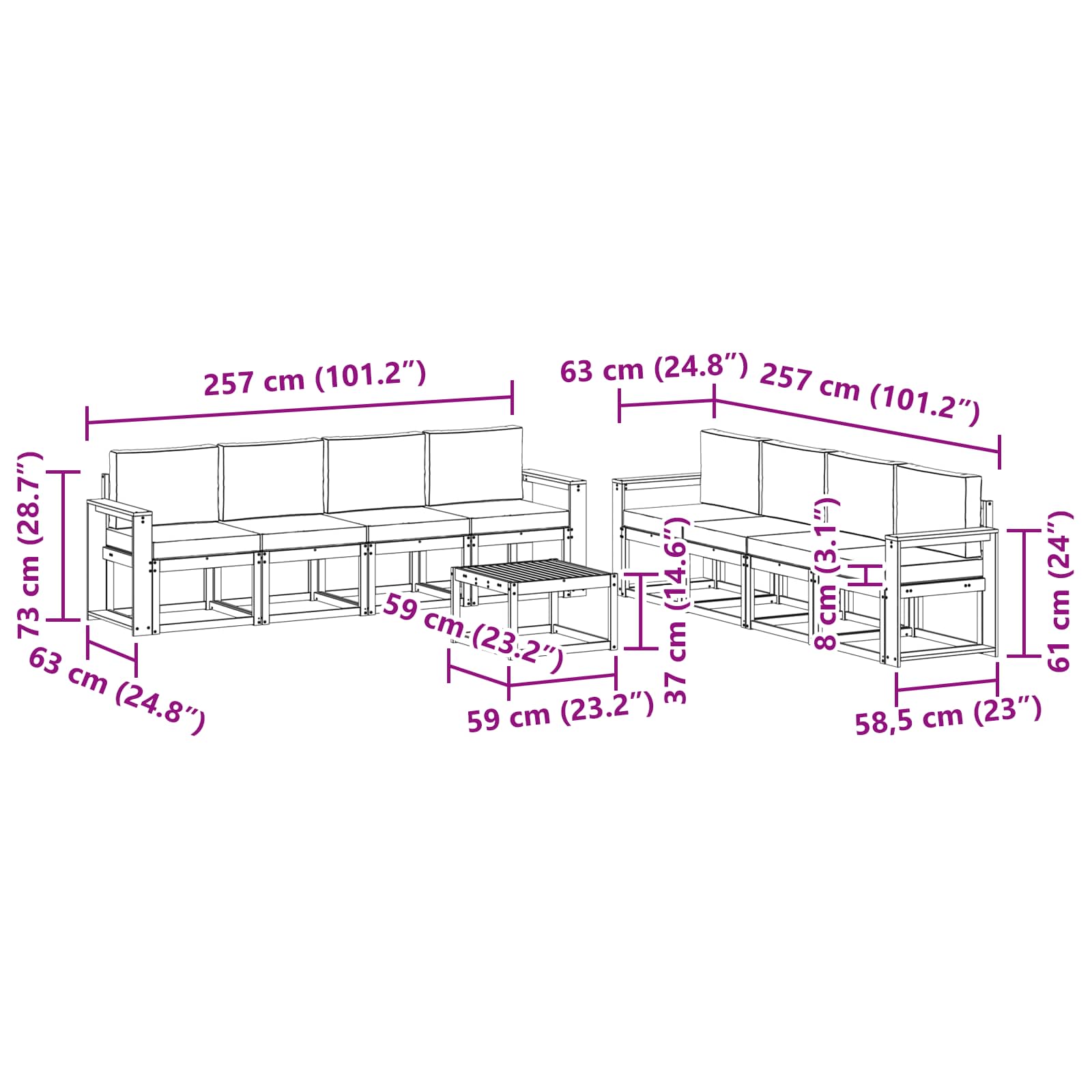 - 8 x Srednji kavč: 59 x 63 x 73 cm (D x Š x V)