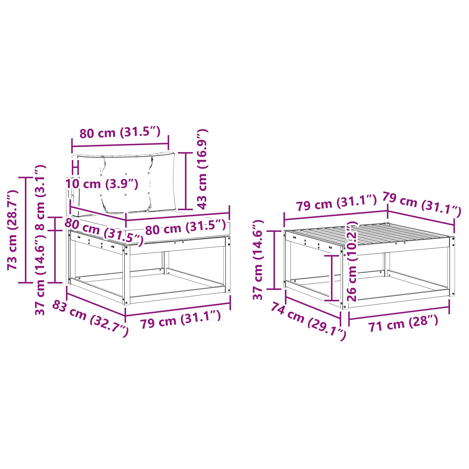 - 8 x Srednja sofa: 79 x 83 x 73 cm (D x Š x V)