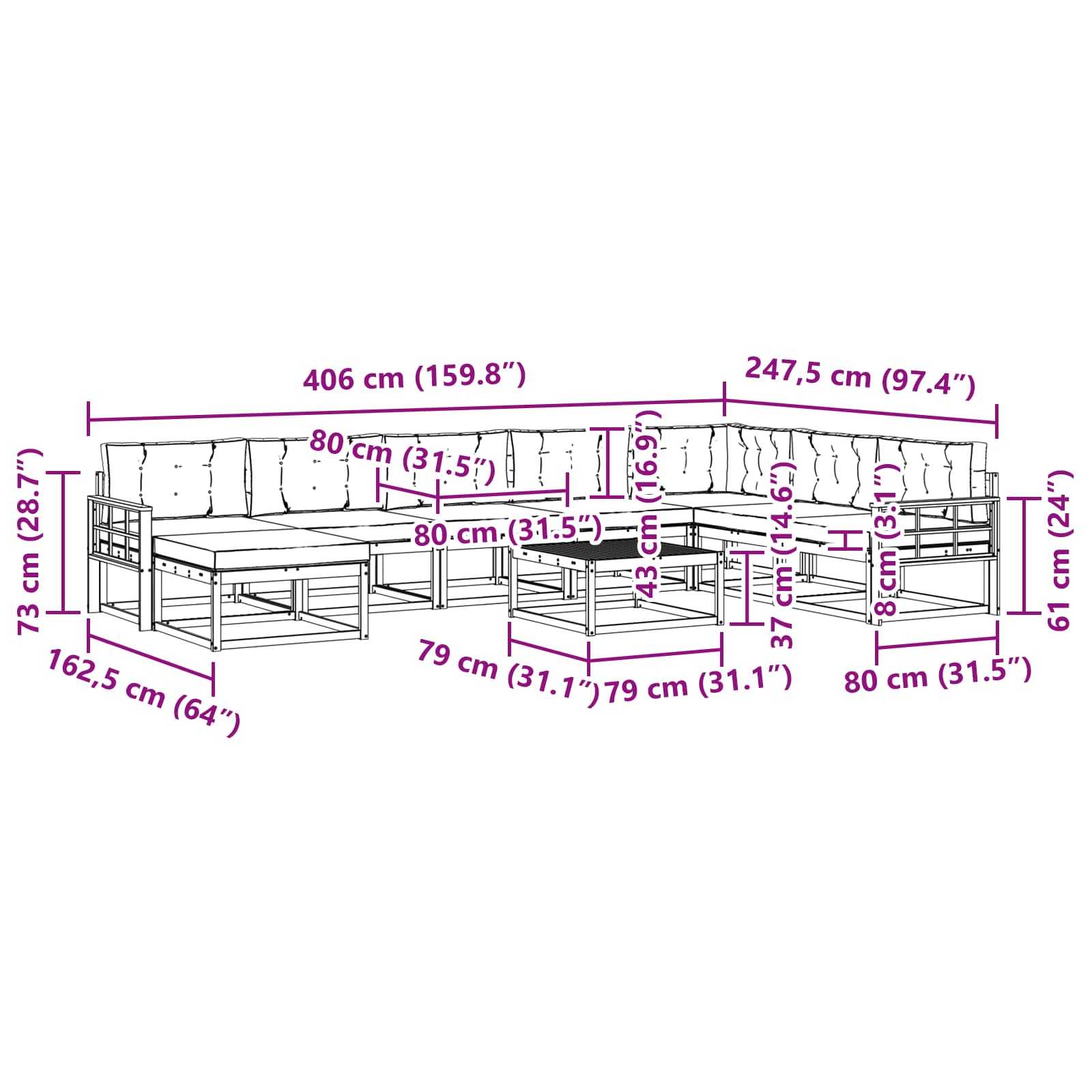 - 8 x Sedežna blazina: 80 x 80 x 8 cm (D x Š x V)