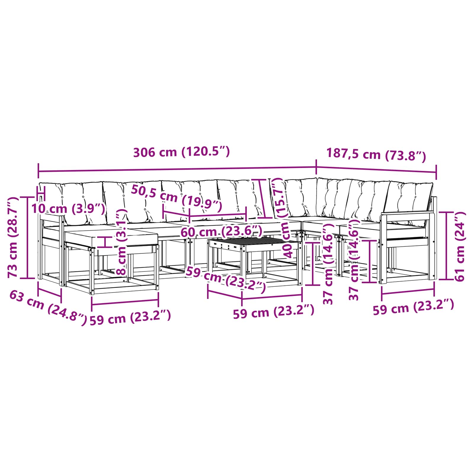 - 8 x Hrbtna blazina: 60 x 40 x 10 cm (D x Š x V)