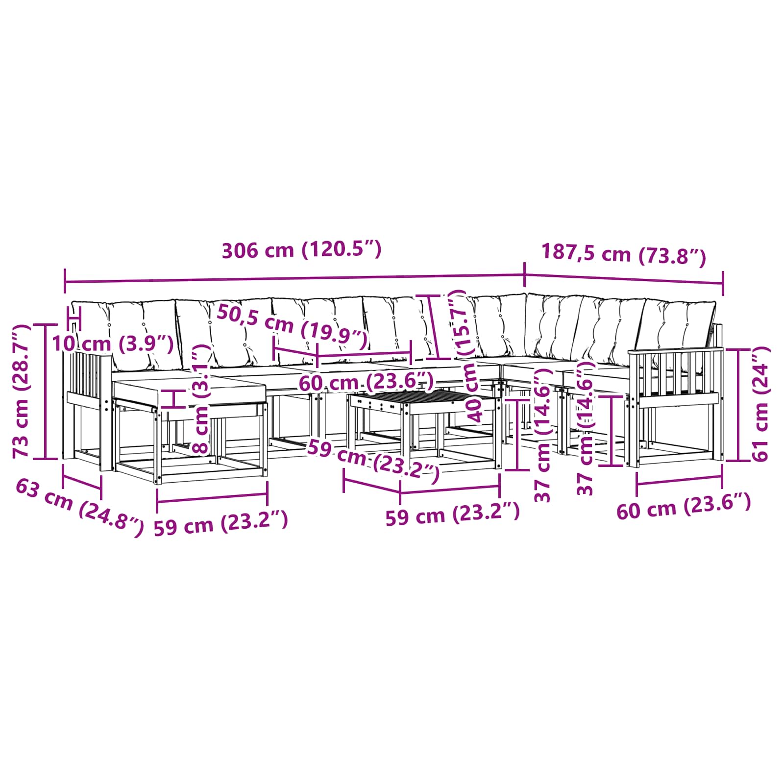 - 8 x Hrbtna blazina: 60 x 40 x 10 cm (D x Š x V)