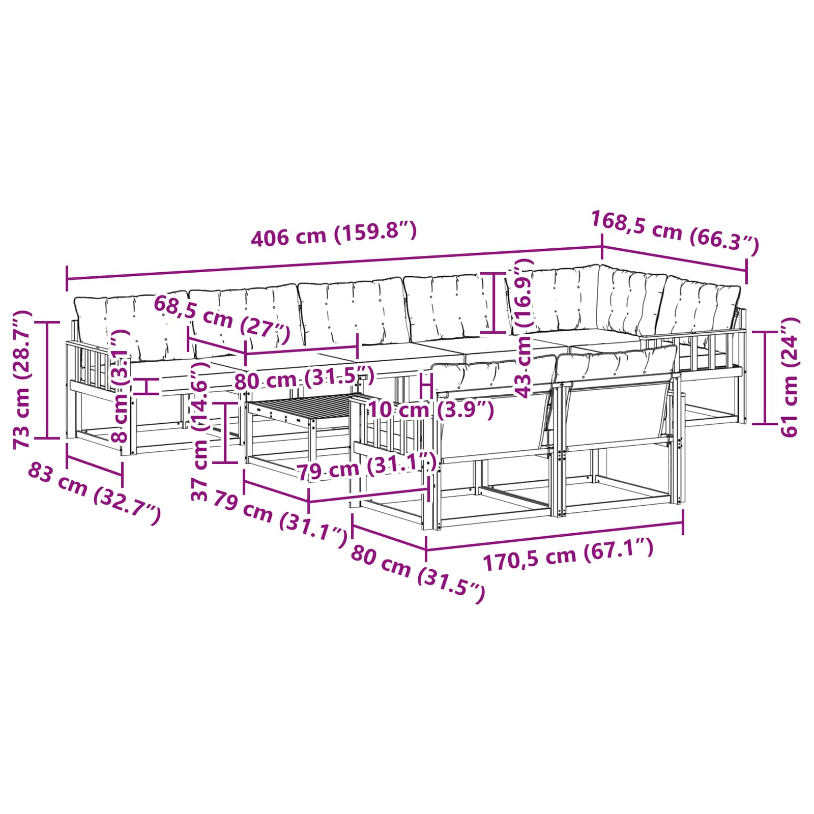 - 7 x Sedežna blazina: 80 x 68,5 x 8 cm (D׊×V)