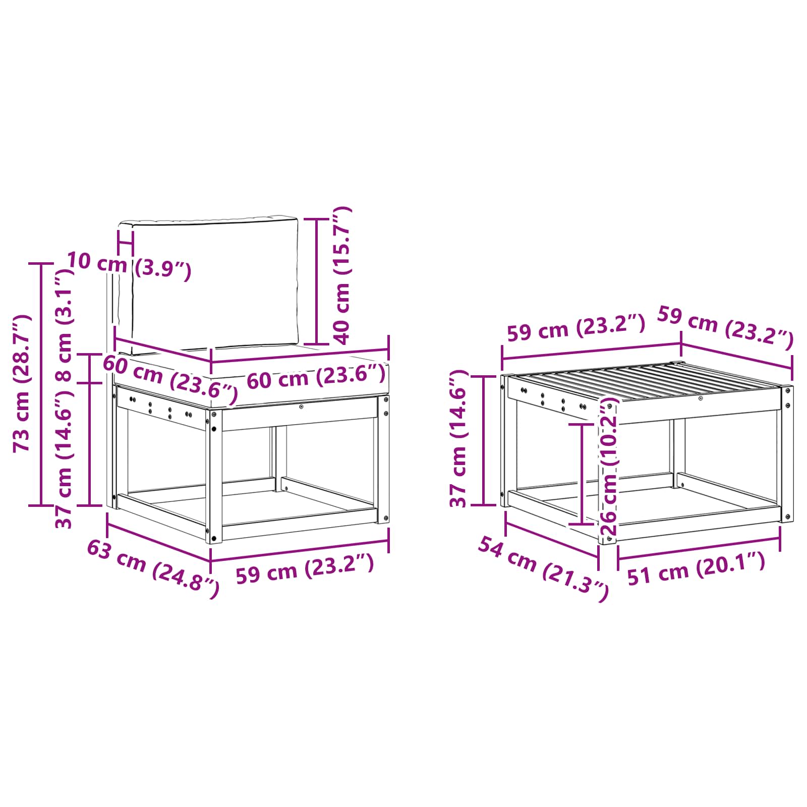 - 8 x Srednja zofo: 59 x 63 x 73 cm (D x Š x V)