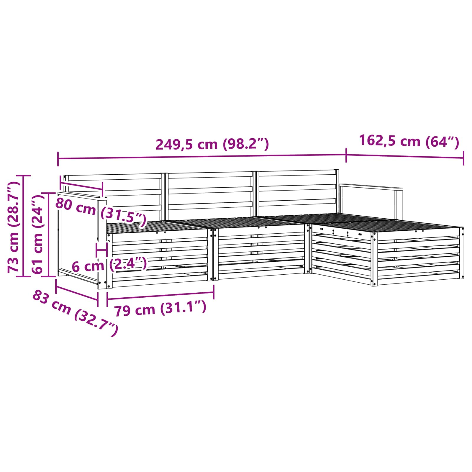 - Splošne dimenzije: 249,5 x 162,5 x 73 cm (D x Š x V)