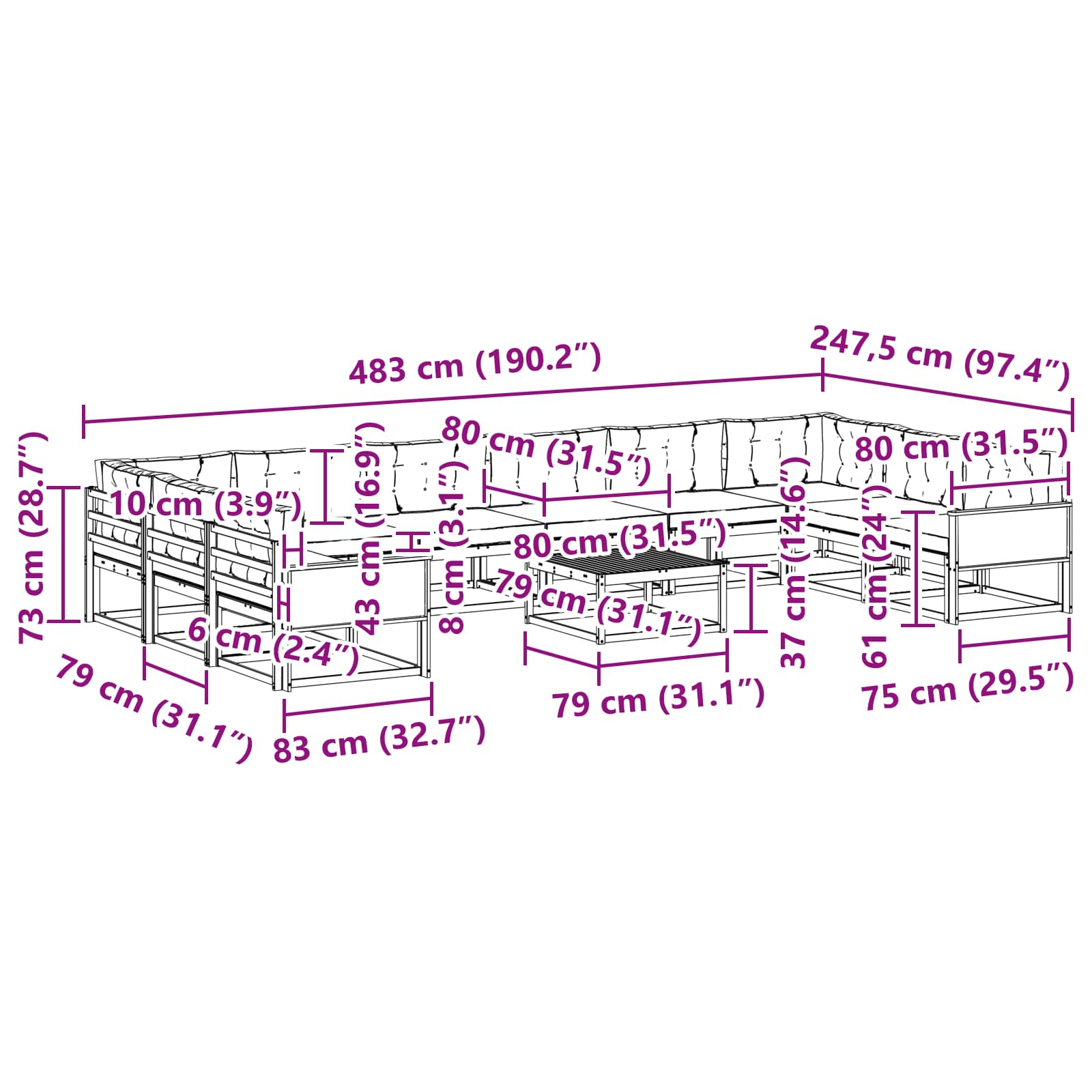 - 8 x Srednji kavč: 79 x 83 x 73 cm (D x Š x V)