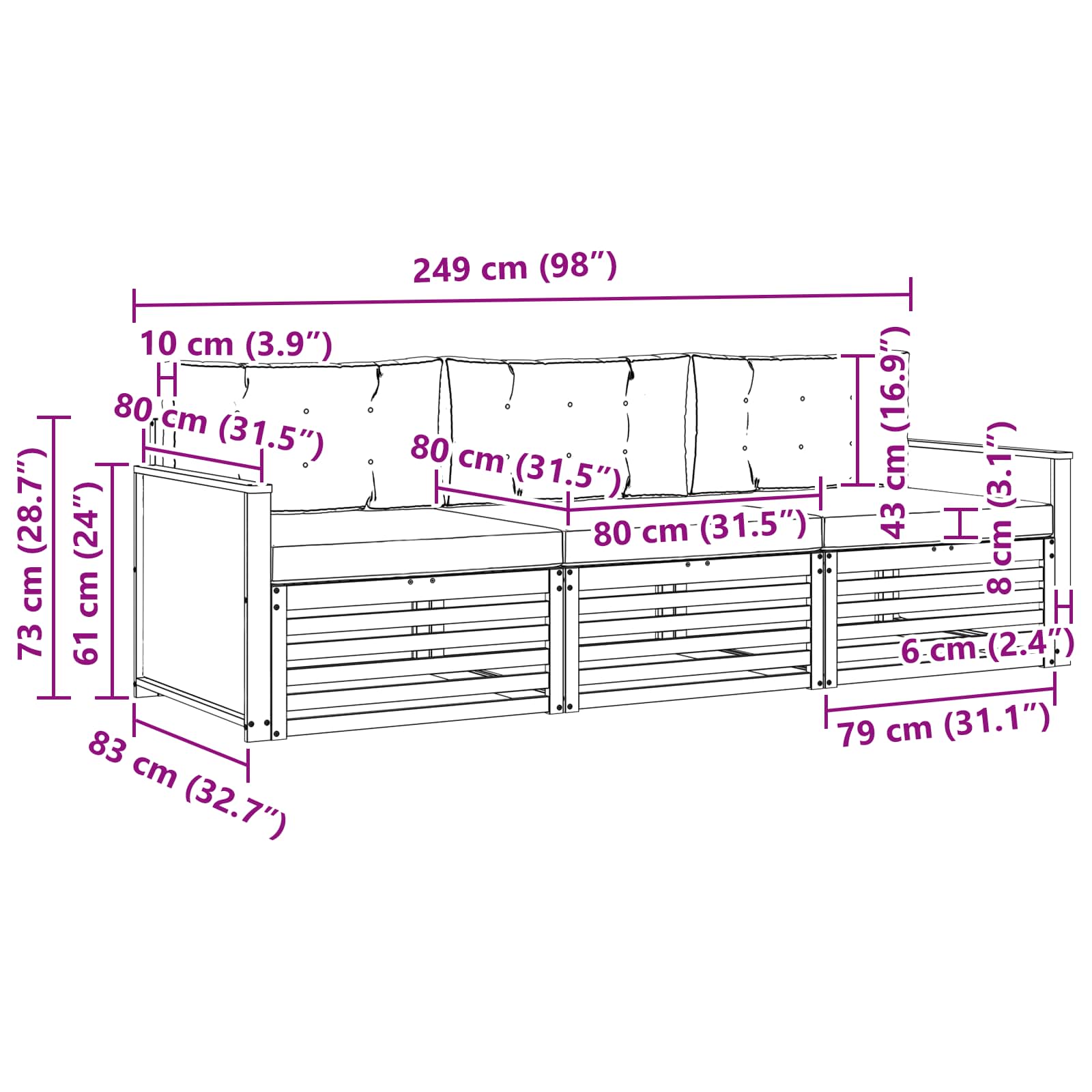 - 3 x Blazina za sedež: 80 x 80 x 8 cm (D x Š x T)