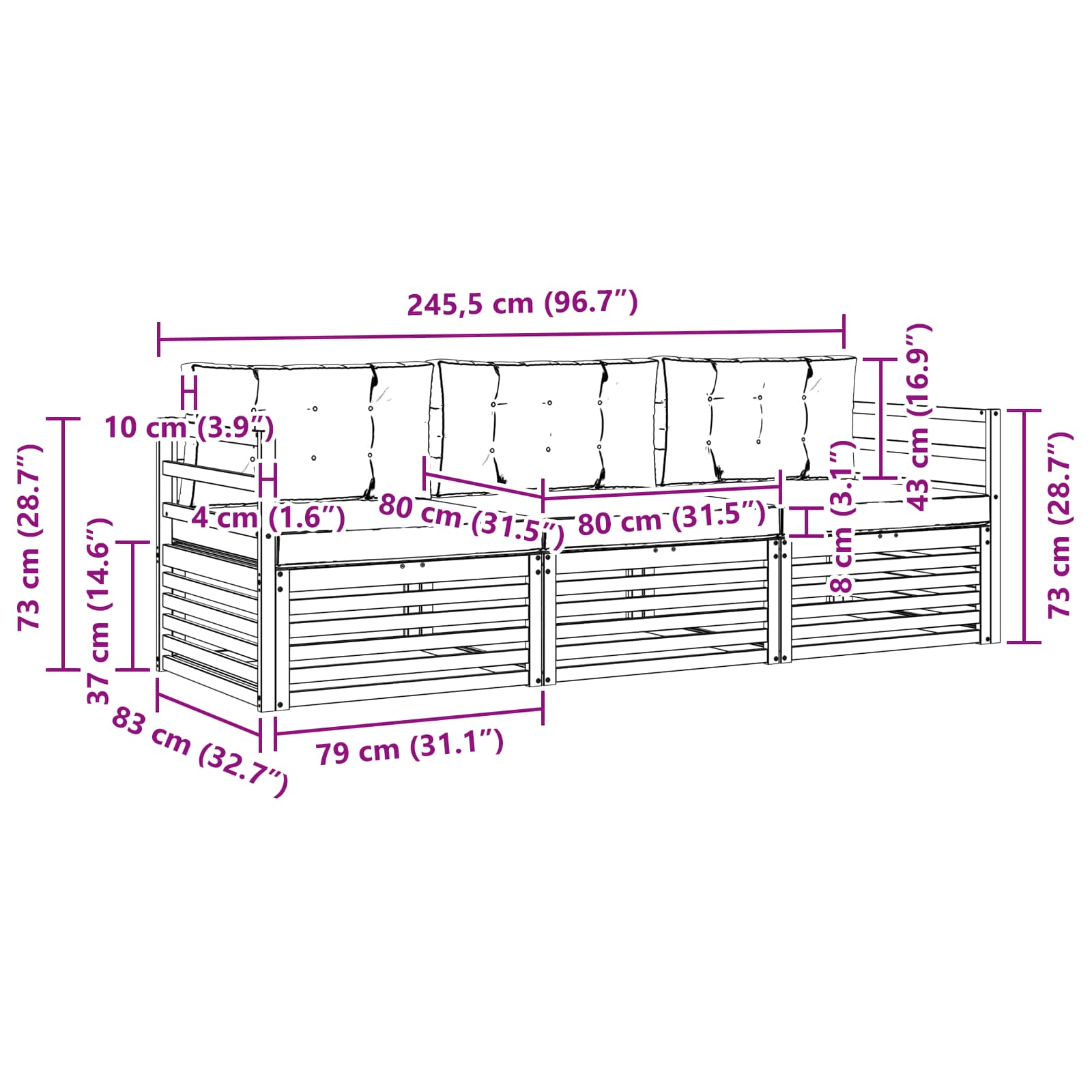 - 3 x Zadnja blazina: 80 x 43 x 10 cm (ŠxVxG)