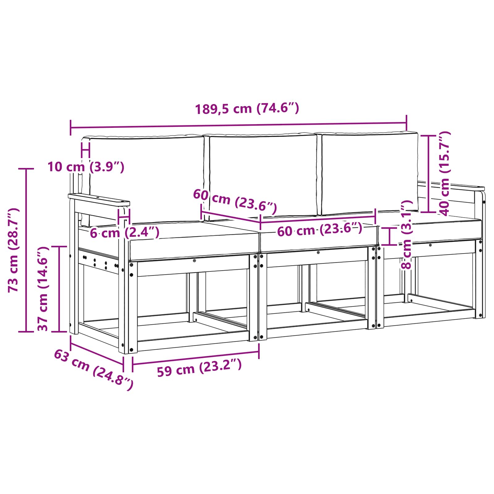 - 3 x Sedežna blazina: 60 x 60 x 8 cm (D x Š x V)