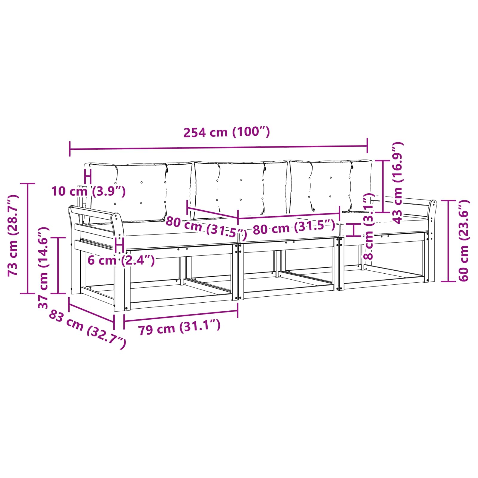 - 3 x hrbtna blazina: 80 x 43 x 10 cm (D x Š x V)