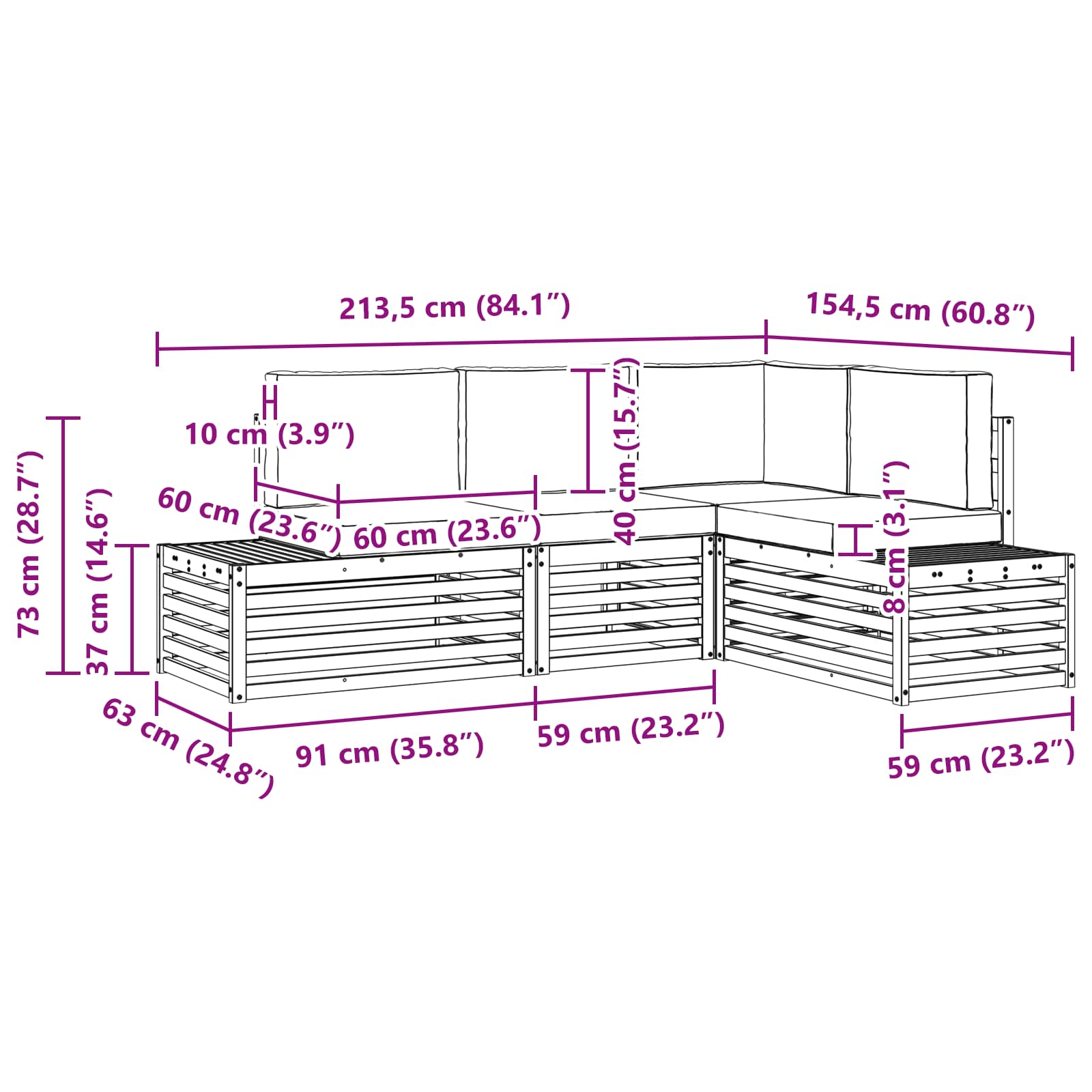 - 4 x blazina za sedenje: 60 x 60 x 8 cm (D x Š x V)