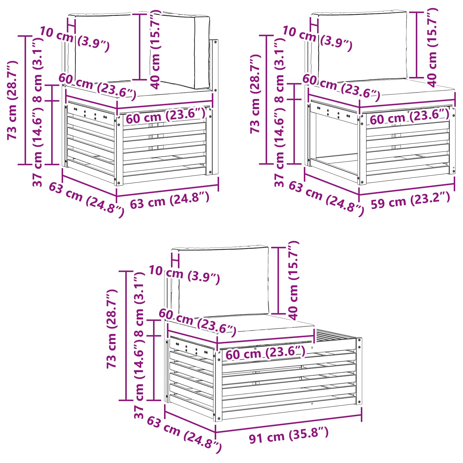 - 2 x končna sedežna: 91 x 63 x 73 cm (D x Š x V)