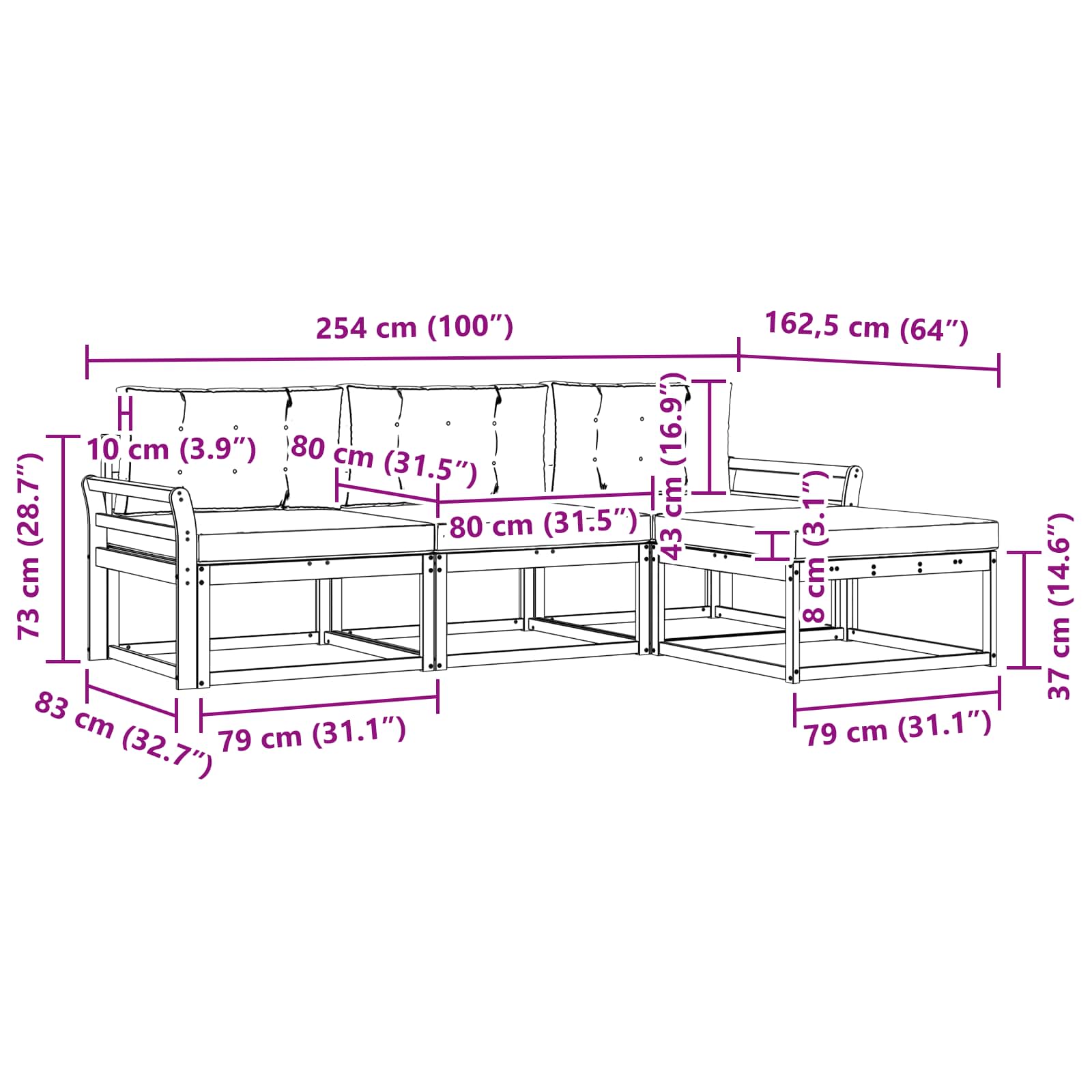- 3 x srednja kavč: 79 x 83 x 73 cm (D x Š x V)