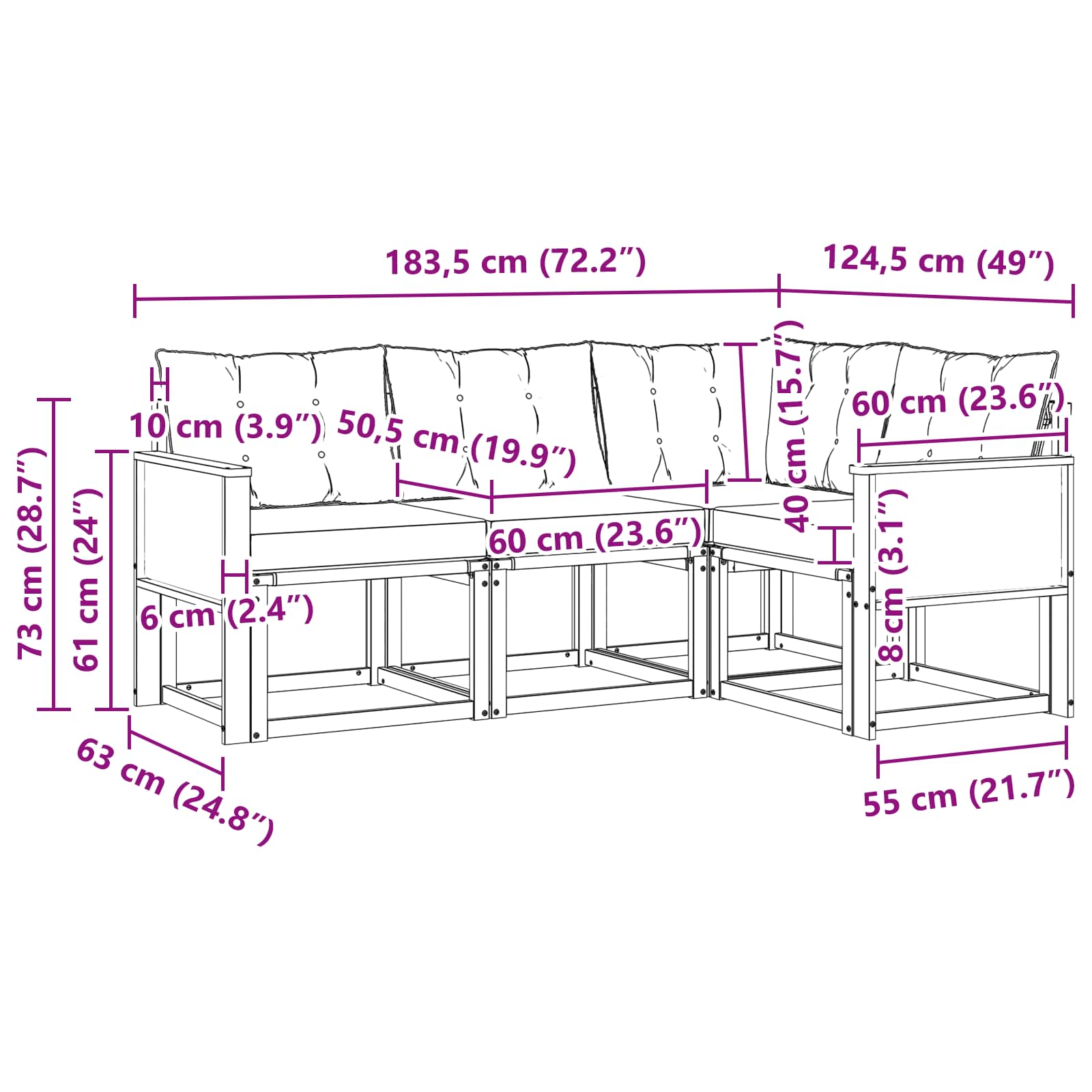 - 5 x Nazadnja blazina: 60 x 40 x 10 cm (D x Š x T)