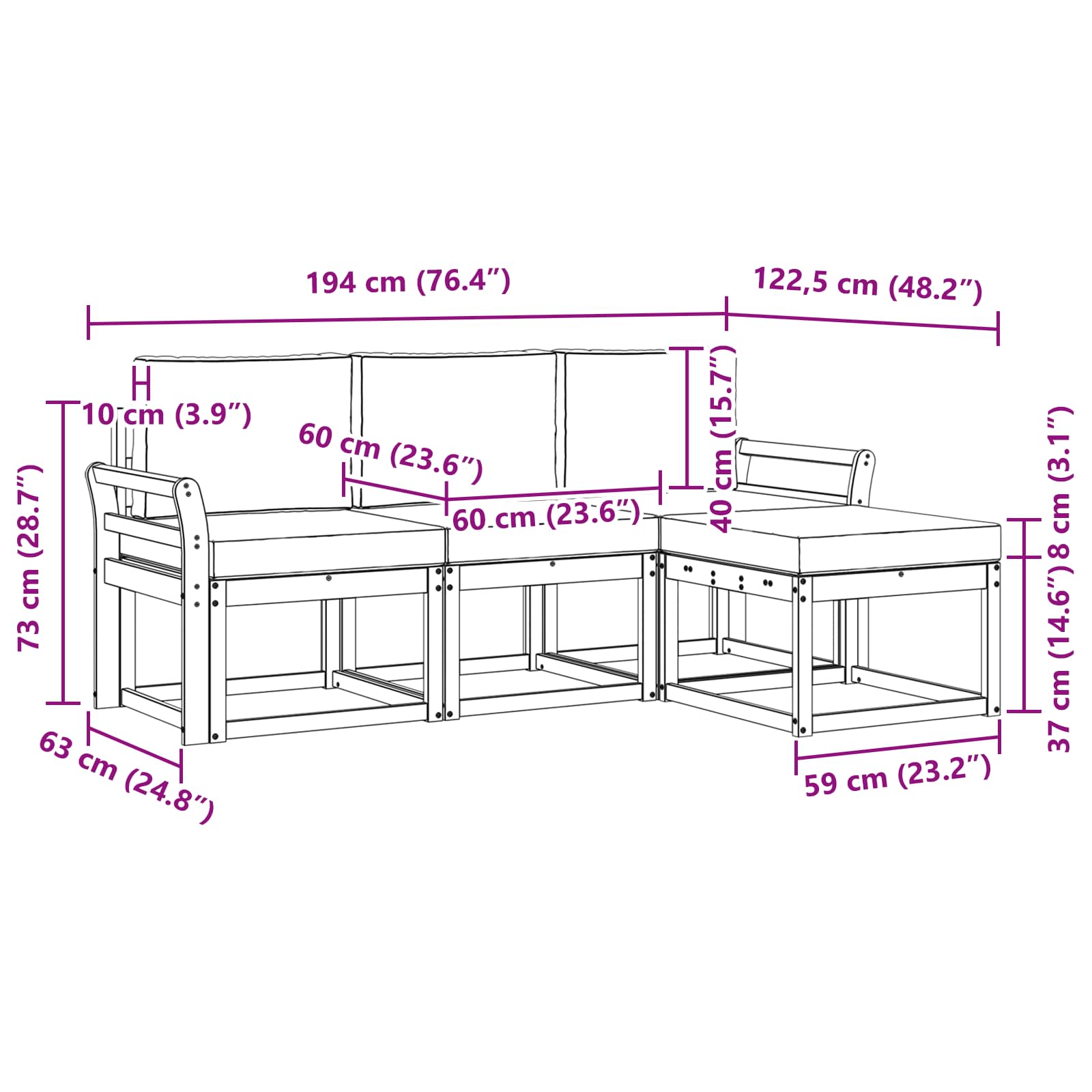 - 4 x sedežna blazina: 60 x 60 x 8 cm (D x Š x V)