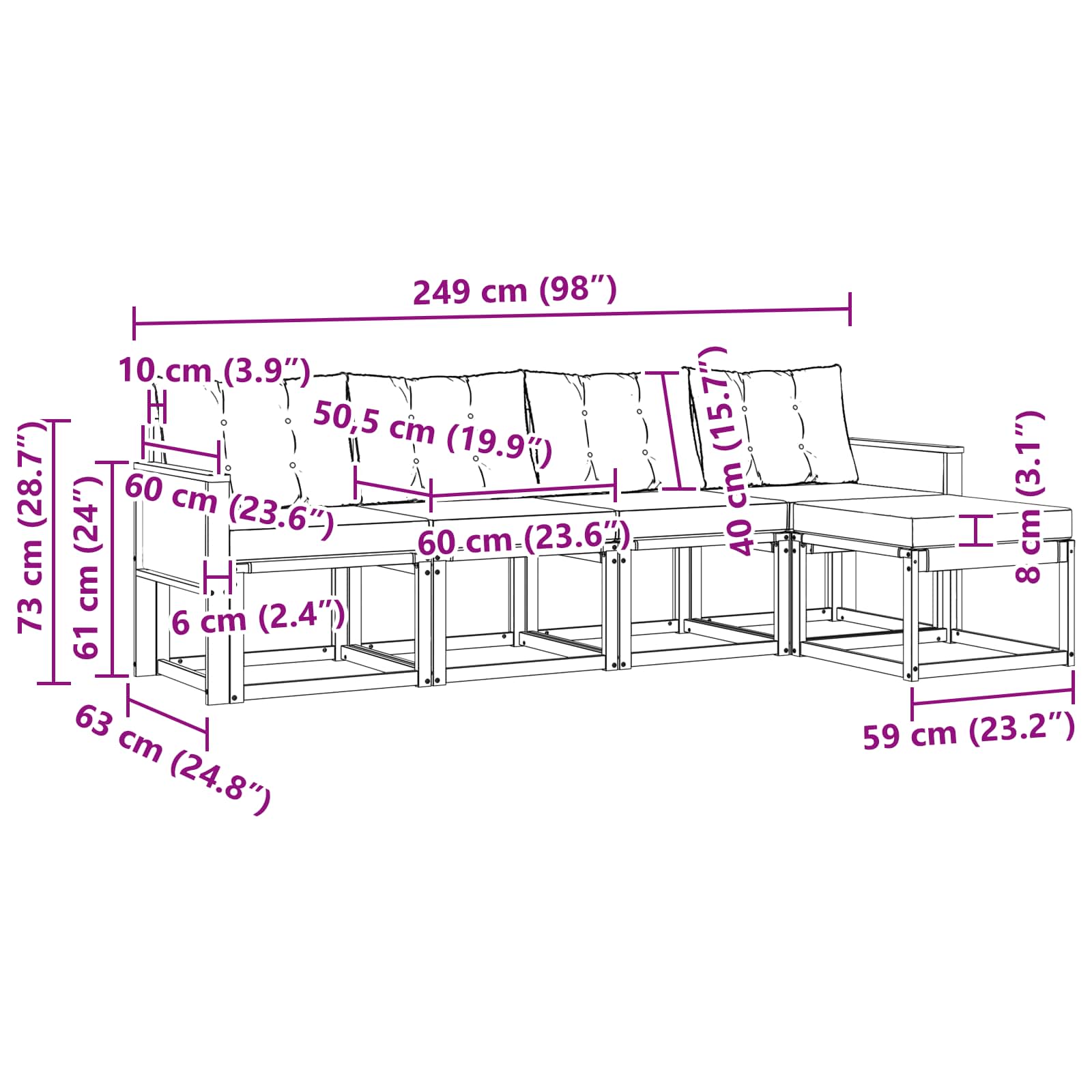 - 4 x Srednji kavč: 59 x 63 x 73 cm (D x Š x V)