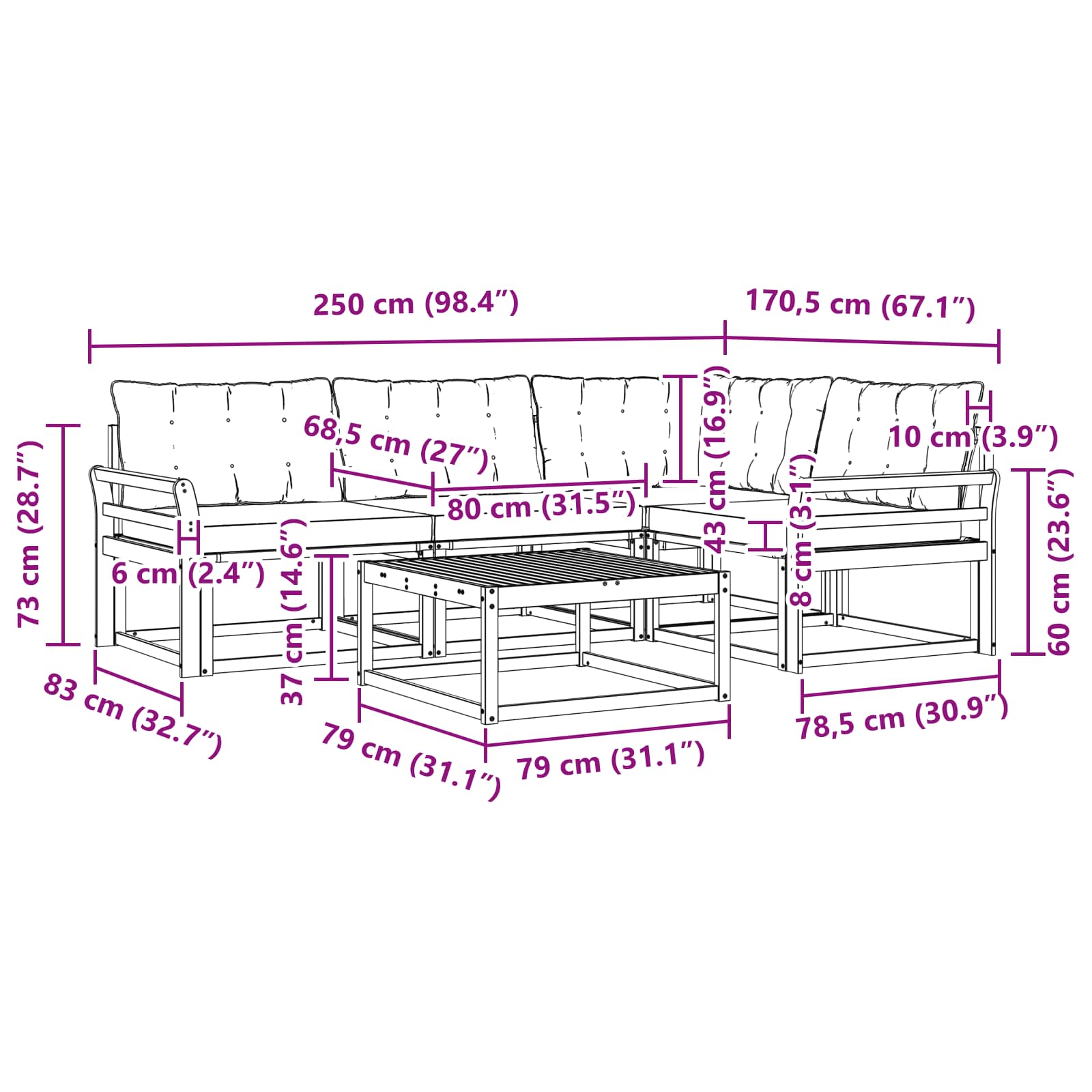 - 1 x Sedežna blazina: 68,5 x 68,5 x 8 cm (DxŠxV)