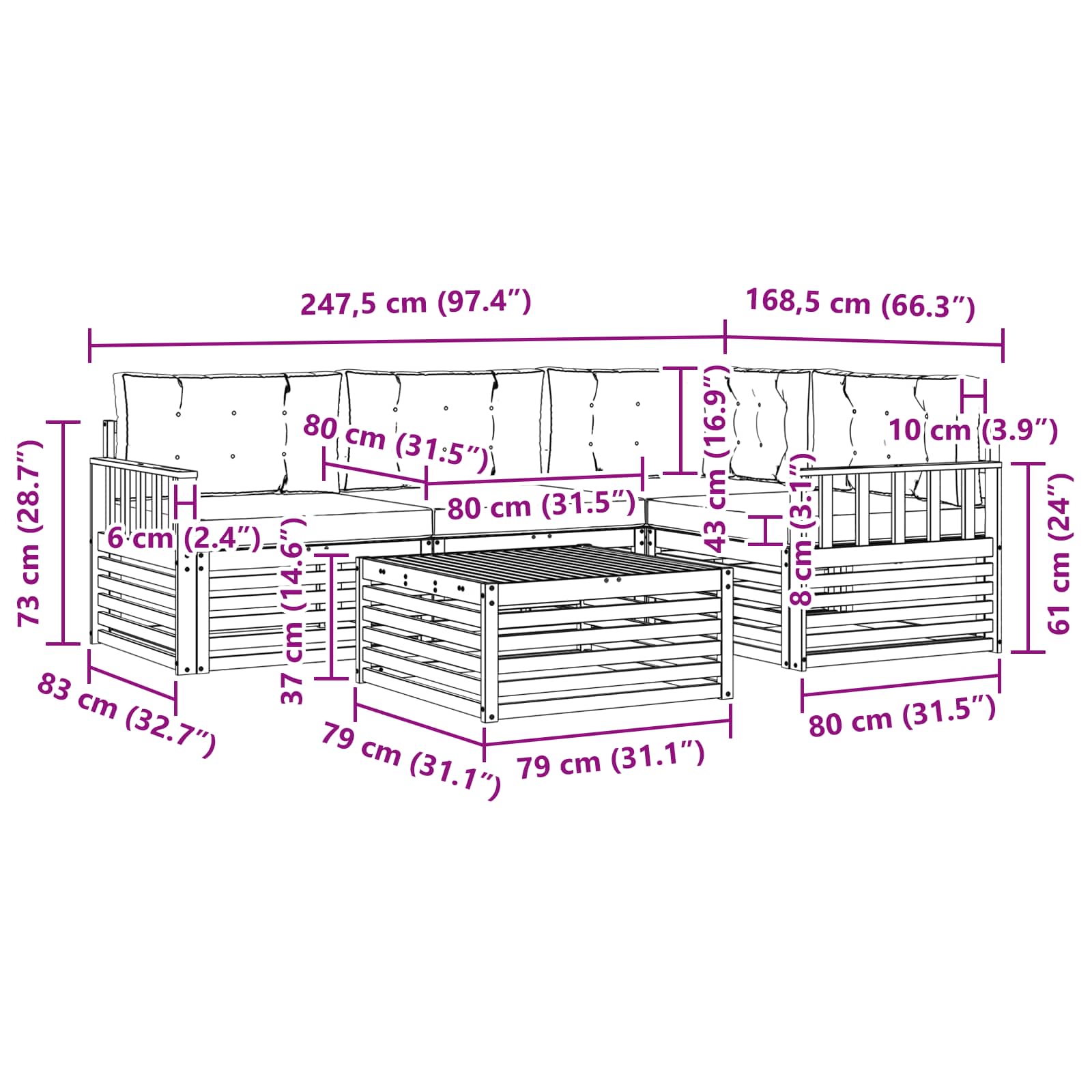 - 4 x Sedalna blazina: 80 x 80 x 8 cm (D x Š x V)
