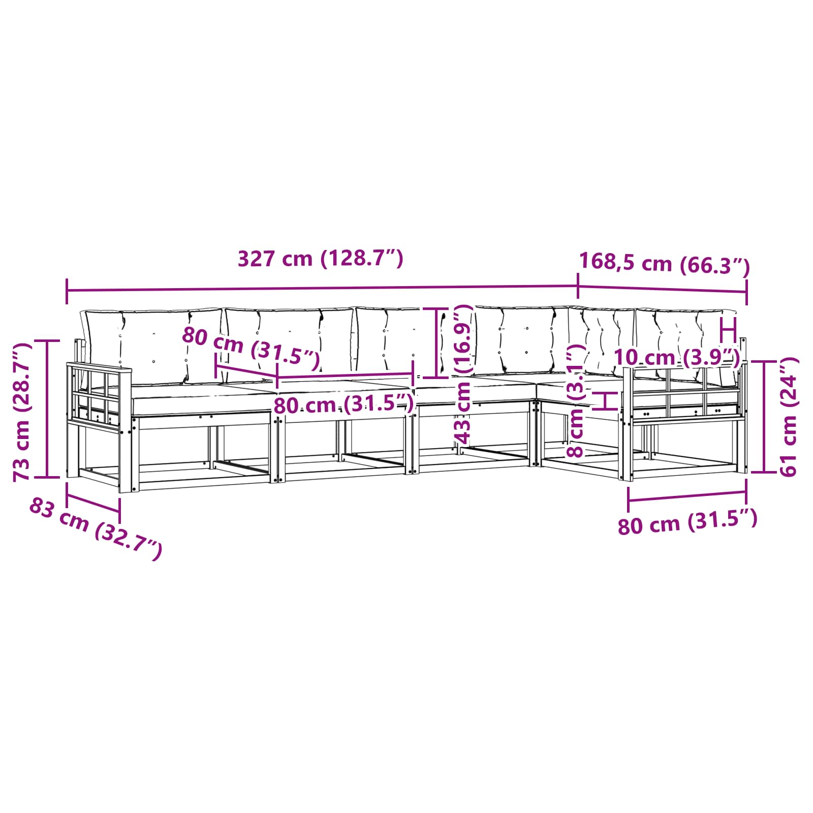 - 5 x Sedežna blazina: 80 x 80 x 8 cm (D x Š x V)