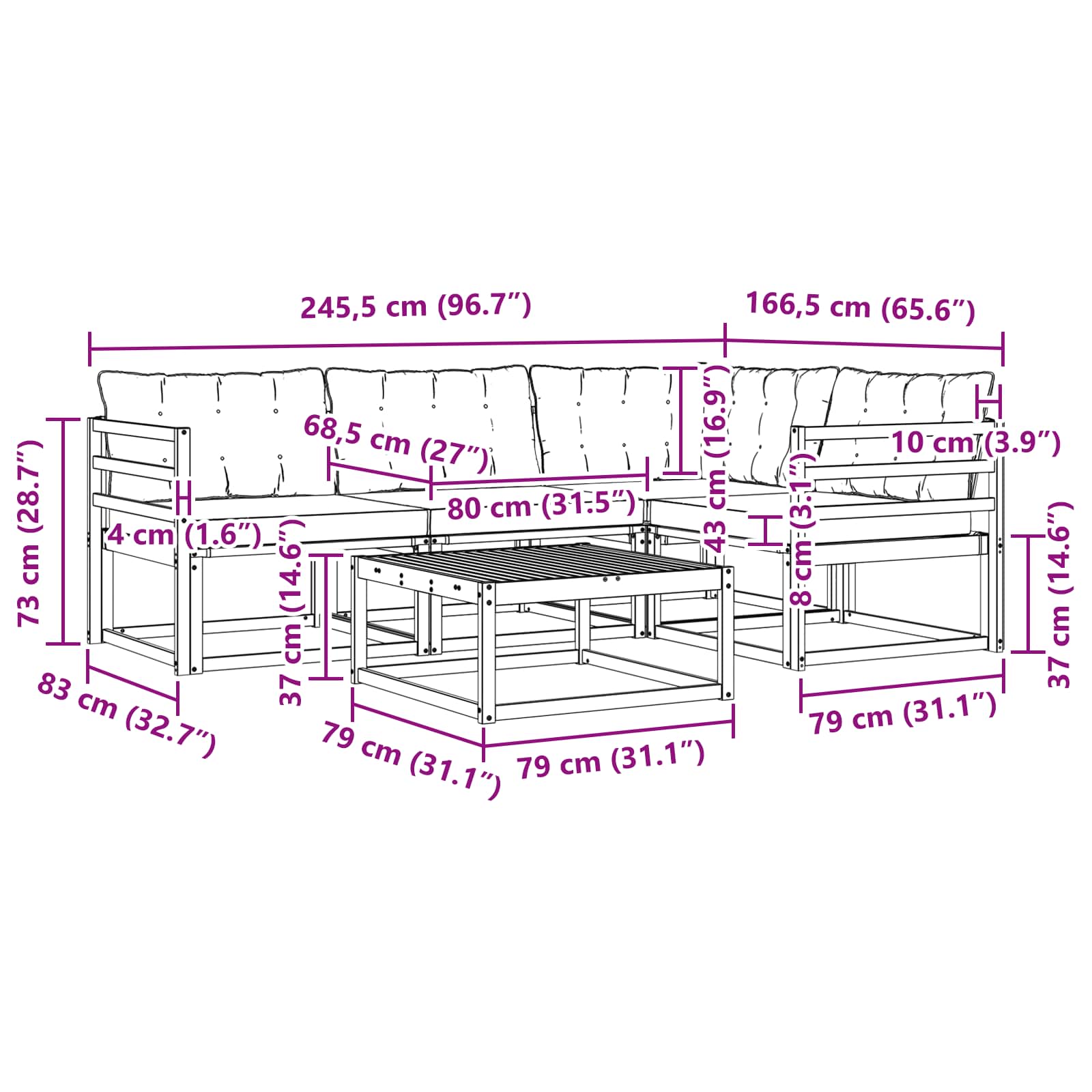 - Splošne dimenzije: 79 x 79 x 37 cm (D x Š x V)