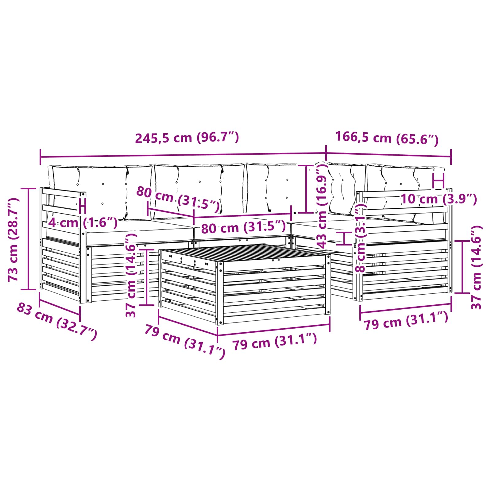 - 4 x Sedalna blazina: 80 x 80 x 8 cm (D x Š x V)