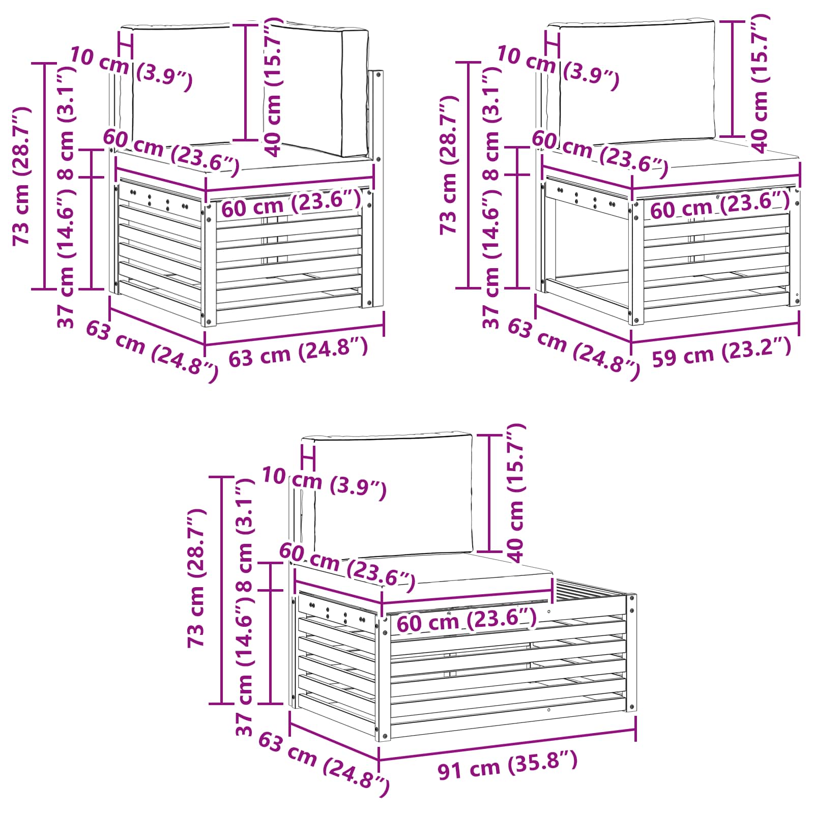 - 3 x srednji kavč: 59 x 63 x 73 cm (DŠV)