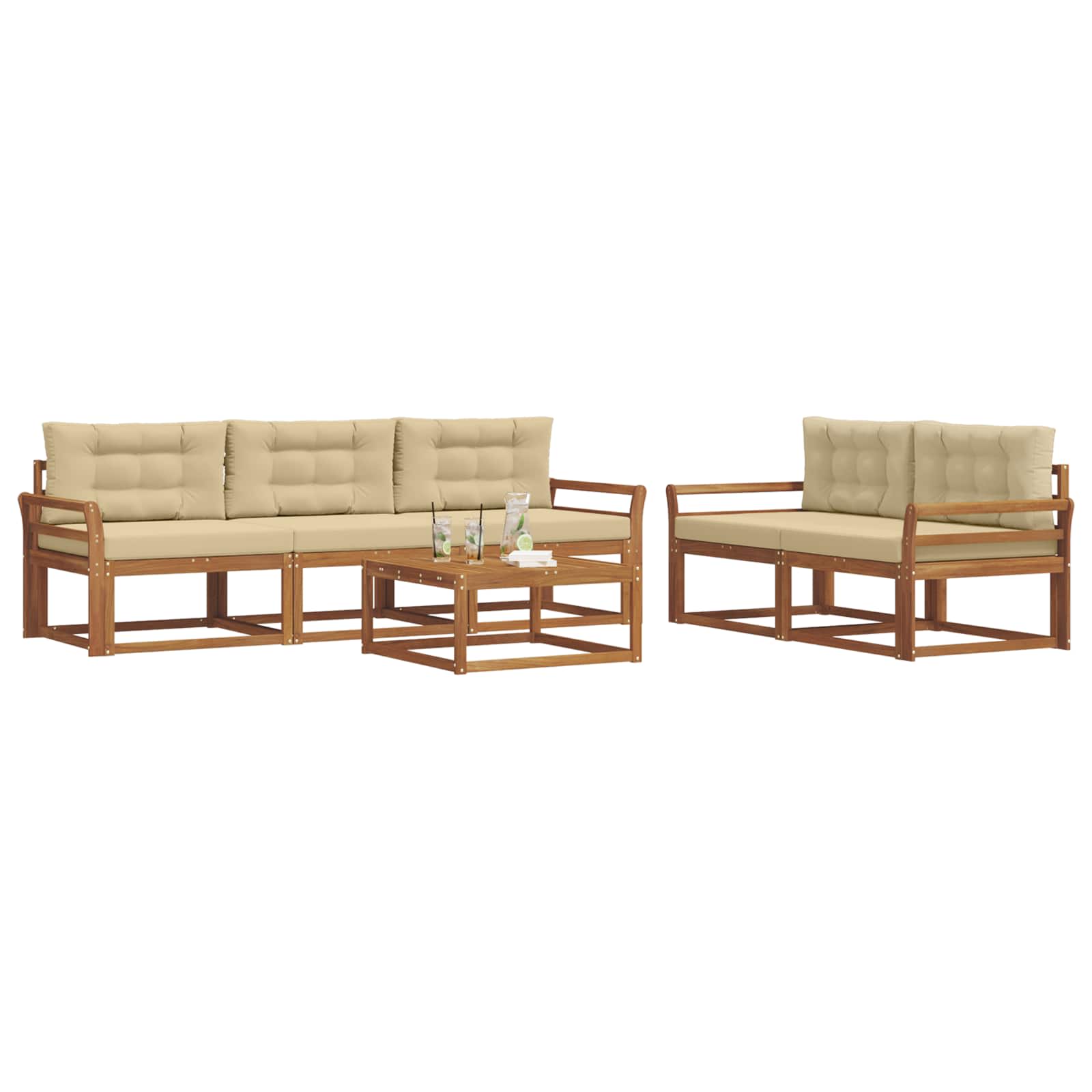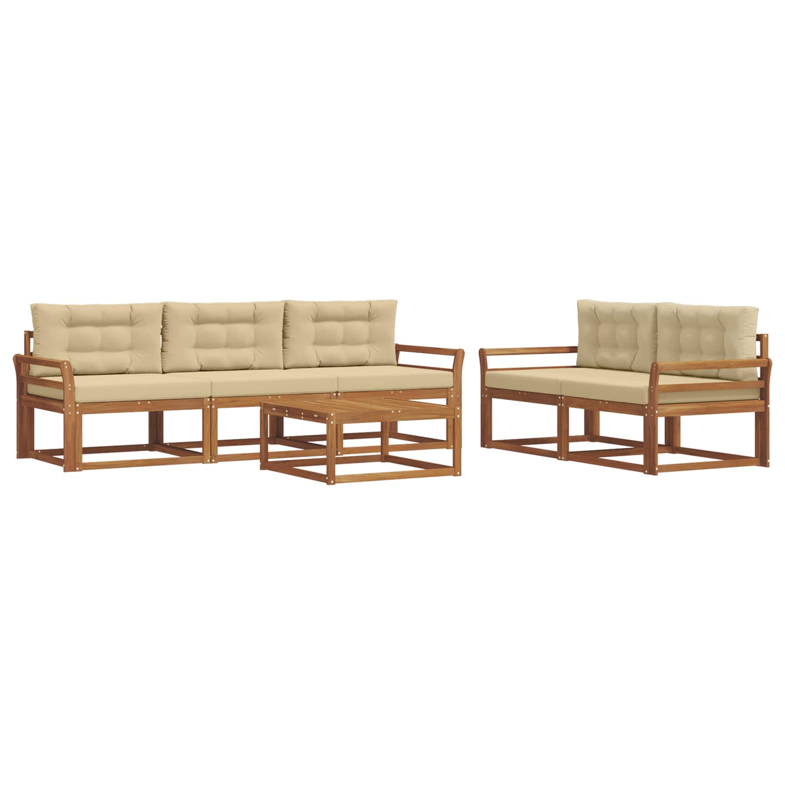 Ta eleganten set sofasetov je točno tisto, kar potrebujete za vaš vrt, teraso ali bazen. Moderno zasnovan, združuje stil in funkcionalnost, njegove tople rjave barve in letvasta hrbtišča prinašajo pridih luksuza, ter ustvarjajo udoben prostor za druženje ali sproščanje. Ne glede na to, ali ste pod streho ali na soncu, ta set prinaša brezčasen šarm in prilagodljivost, kar vabi vse, da uživajo v zunanjih trenutkih. Trden akacijev les: Ta sofaset je narejen iz vrhunskega trdega akacijevega lesa, kar zagotavlja naravno lepoto in trpežnost. Akacija je znana po svoji odpornosti na vreme in obrabo, kar podaljšuje življenjsko dobo pohištva. Lesena struktura je enostavna za vzdrževanje in idealna za moderne uporabnike. Letvasta zasnova: Z elegantno letvasto zasnovo, ta sofaset prinaša funkcionalnost in zračnost. Ergonomična podpora za hrbet nudi udobje, estetska zasnova pa izboljšuje zunanje površine, kar ustvarja prijetna mesta za druženje ali sprostitev. Fiksni letvičasti okvir: Z močno, fiksno zasnovo okvirja, ta sofaset zagotavlja stabilnost in zanesljivost. Idealna izbira za zunanje prostore, konstrukcija pa doda estetsko vrednost, ki poudarja tako trpežnost kot šik izgled. Lastnost odporna na vreme: Zasnovan za zunanjo uporabo, ta set je odporen na različne vremenske pogoje. Od sončnega vremena do vetrovnih večerov, materiali in zasnova zaščitijo pohištvo, da ostane udobno skozi vse leto. Modularna konfiguracija: Ta sofaset vam omogoča, da prilagodite svoje sedežne postavitve, kar je super za različne priložnosti. Ustvarite intime skupine ali širša ležišča, kar se enostavno prilagaja vašim potrebam. Njegova vsestranskost povečuje uporabnost in omogoča prilagoditev prostora po želji.