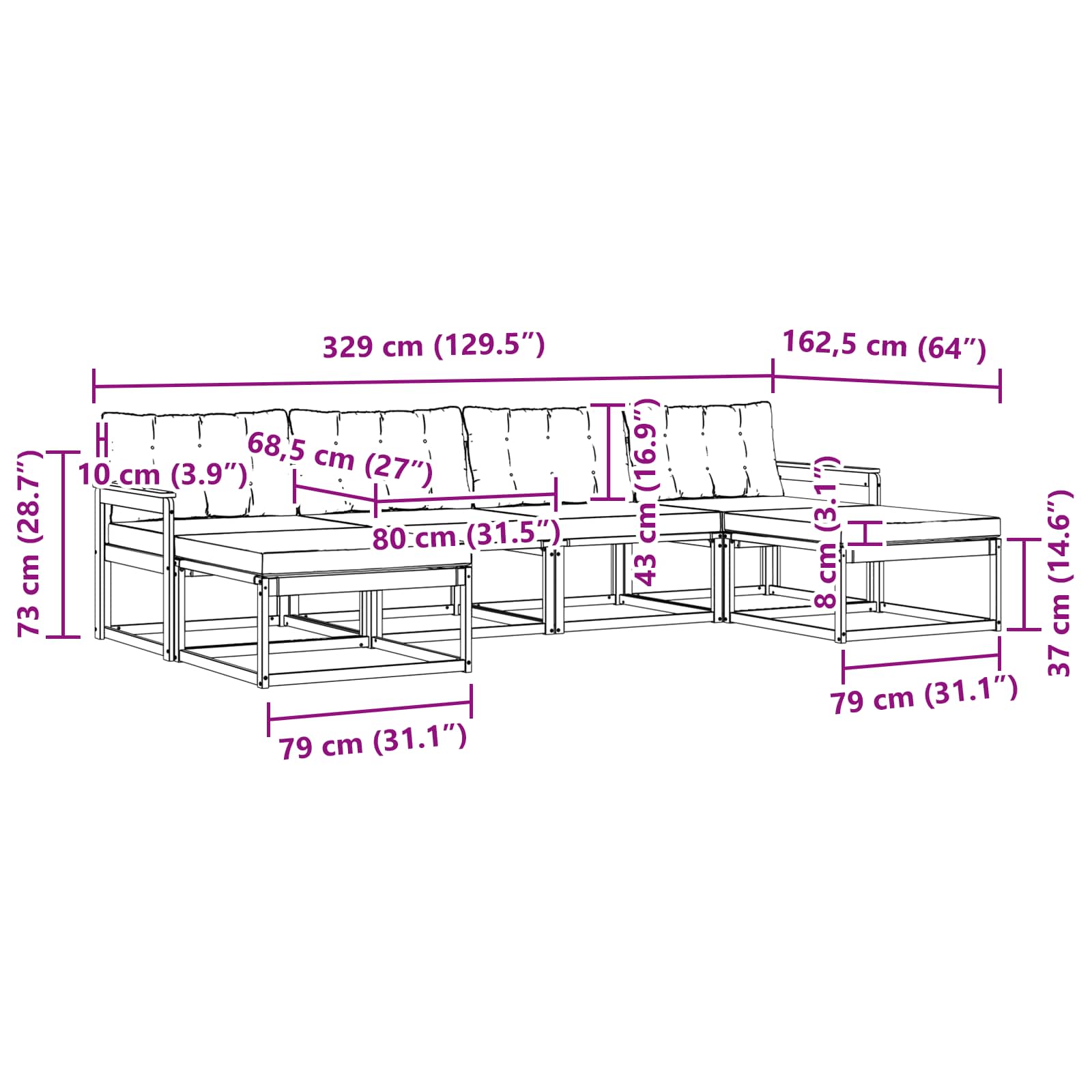 - 4 x Sedežna blazina: 80 x 68,5 x 8 cm (D x Š x V)