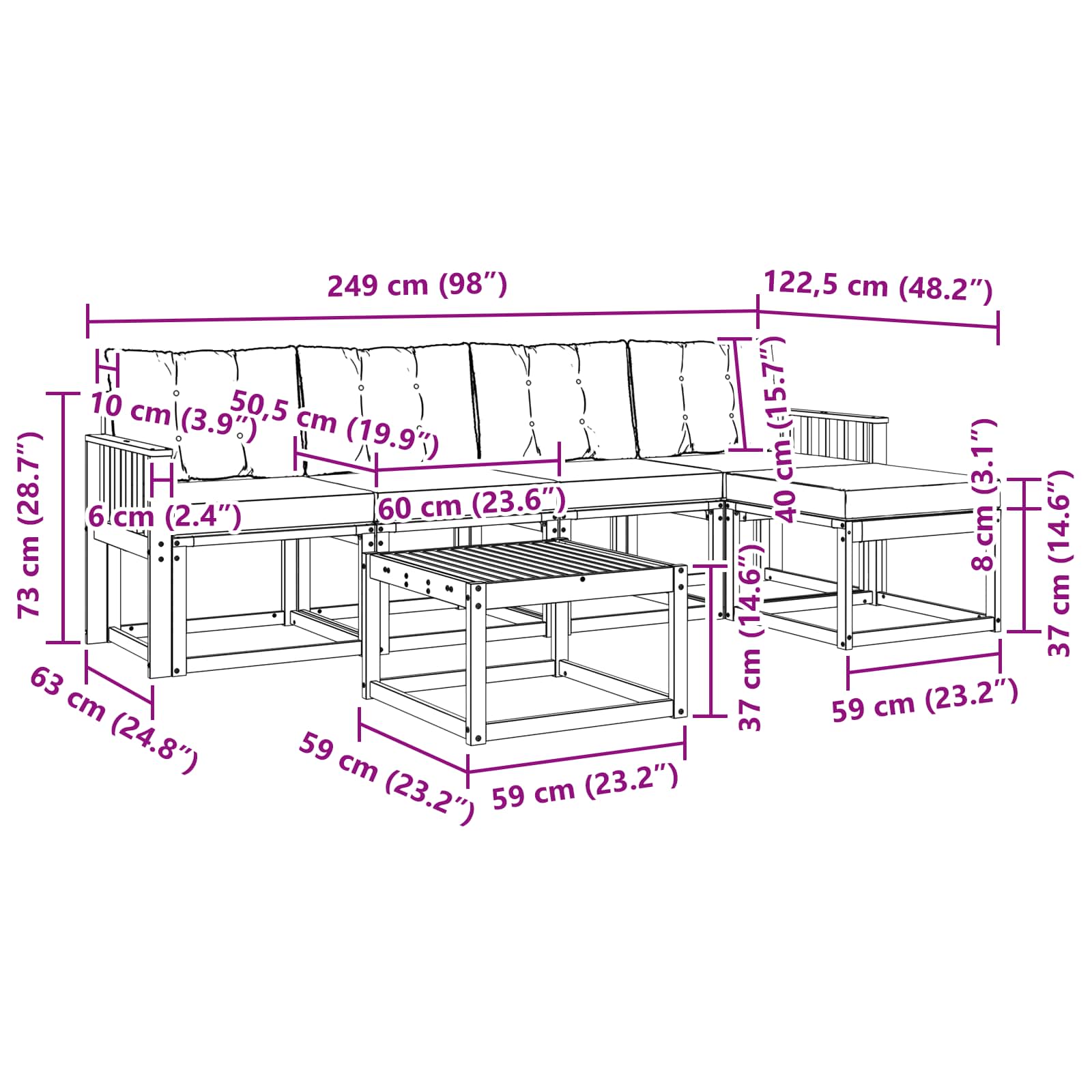 - 4 x Srednji kavč: 59 x 63 x 73 cm (D x Š x V)