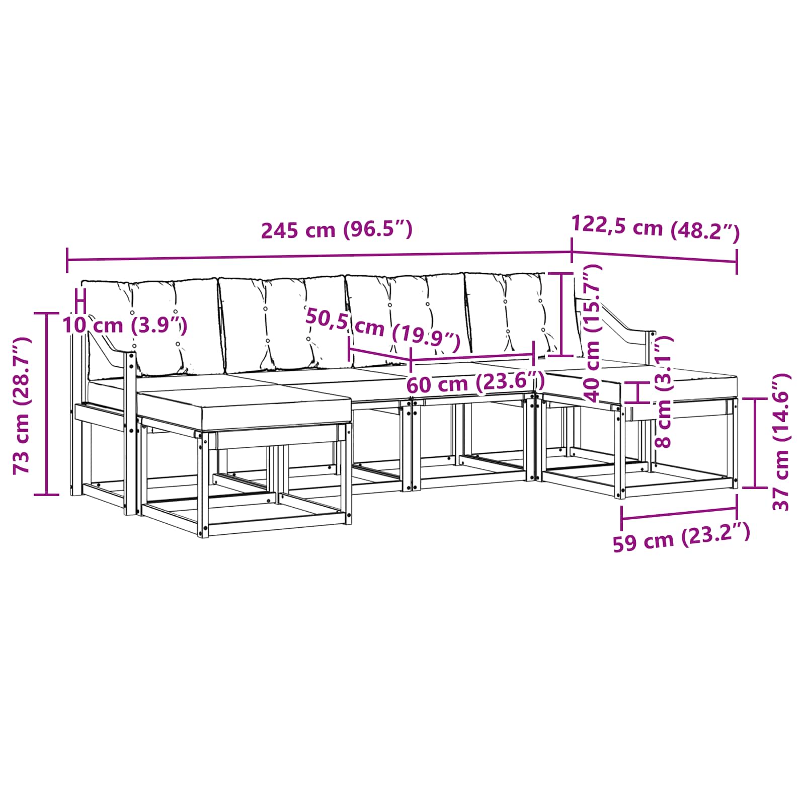 - 4 x Srednji kavč: 59 x 63 x 73 cm (D x Š x V)