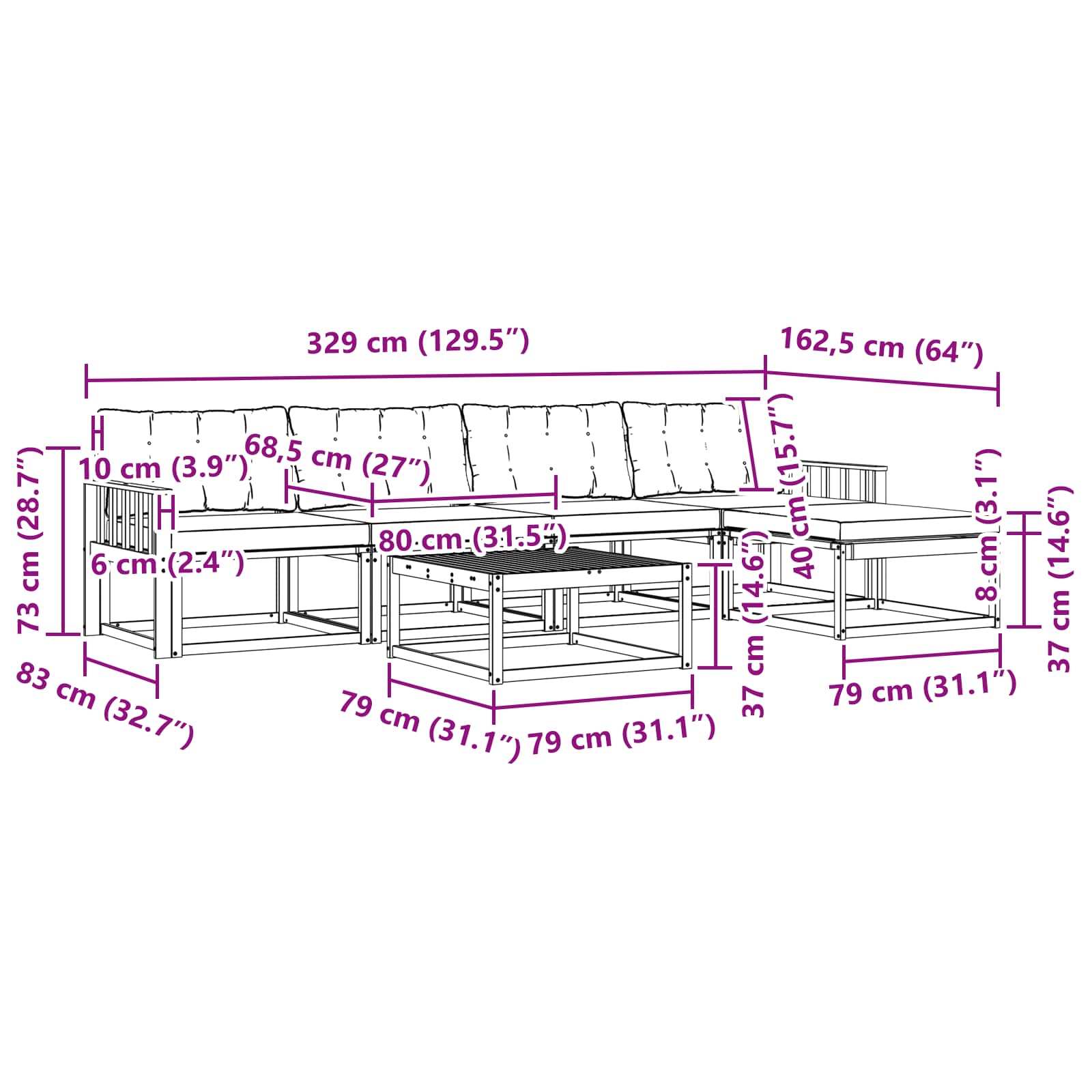 - 4 x Srednji kavč: 79 x 83 x 73 cm (DxŠxV)