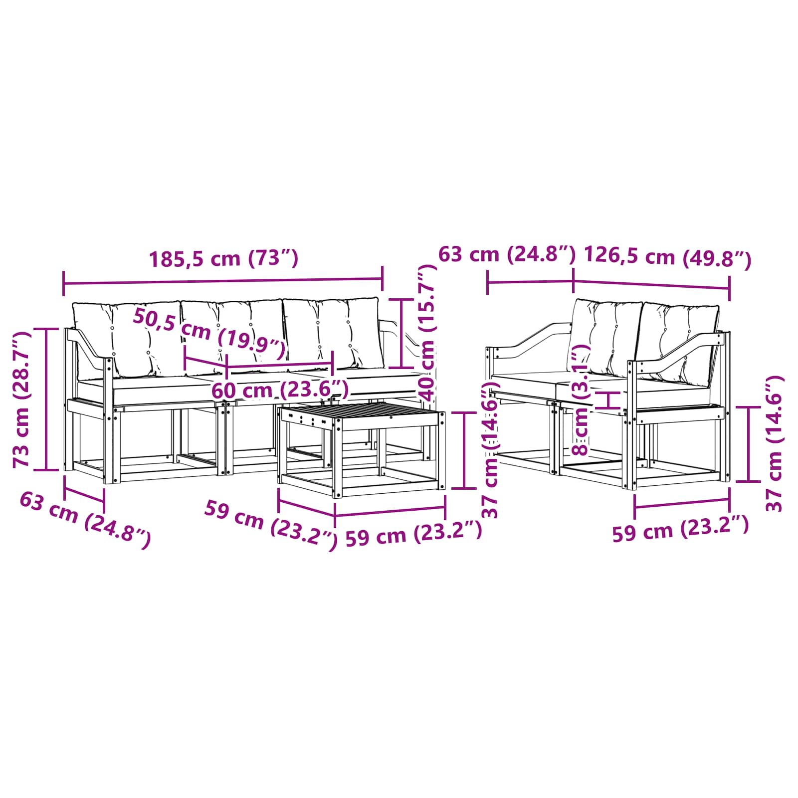 - 5 x Srednji kavč: 59 x 63 x 73 cm (D x Š x V)