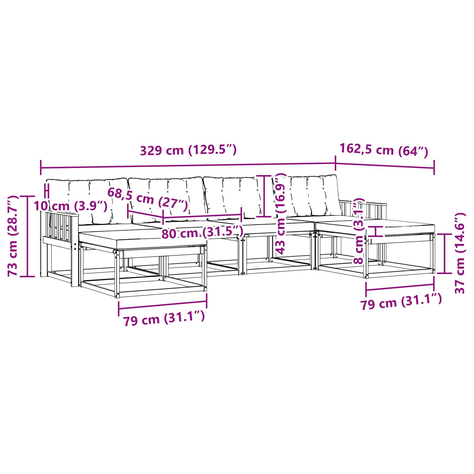 - 4 x srednja sedežna garnitura: 79 x 83 x 73 cm (D x Š x V)