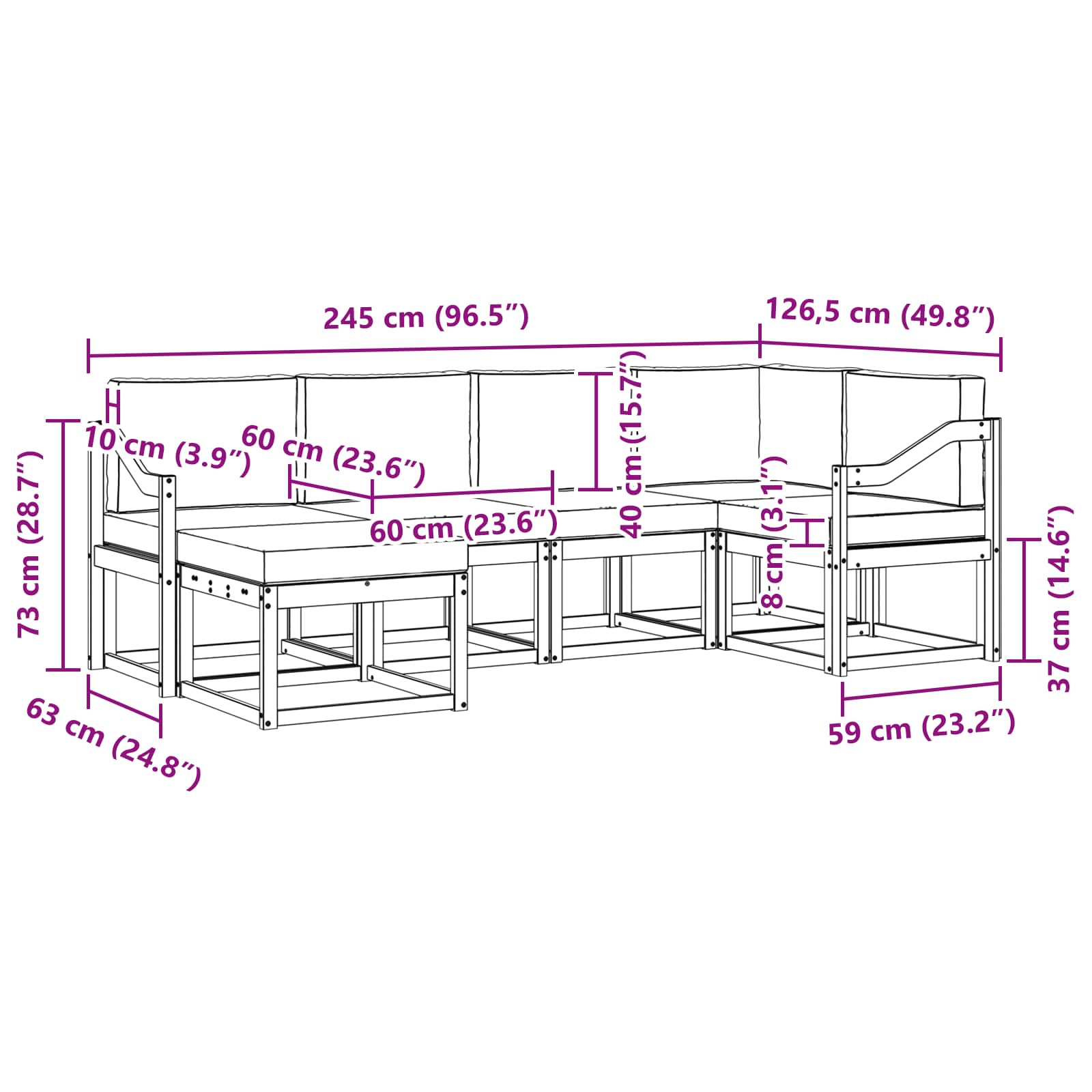 - 6 x sedežno blazino: 60 x 60 x 8 cm (D x Š x V)