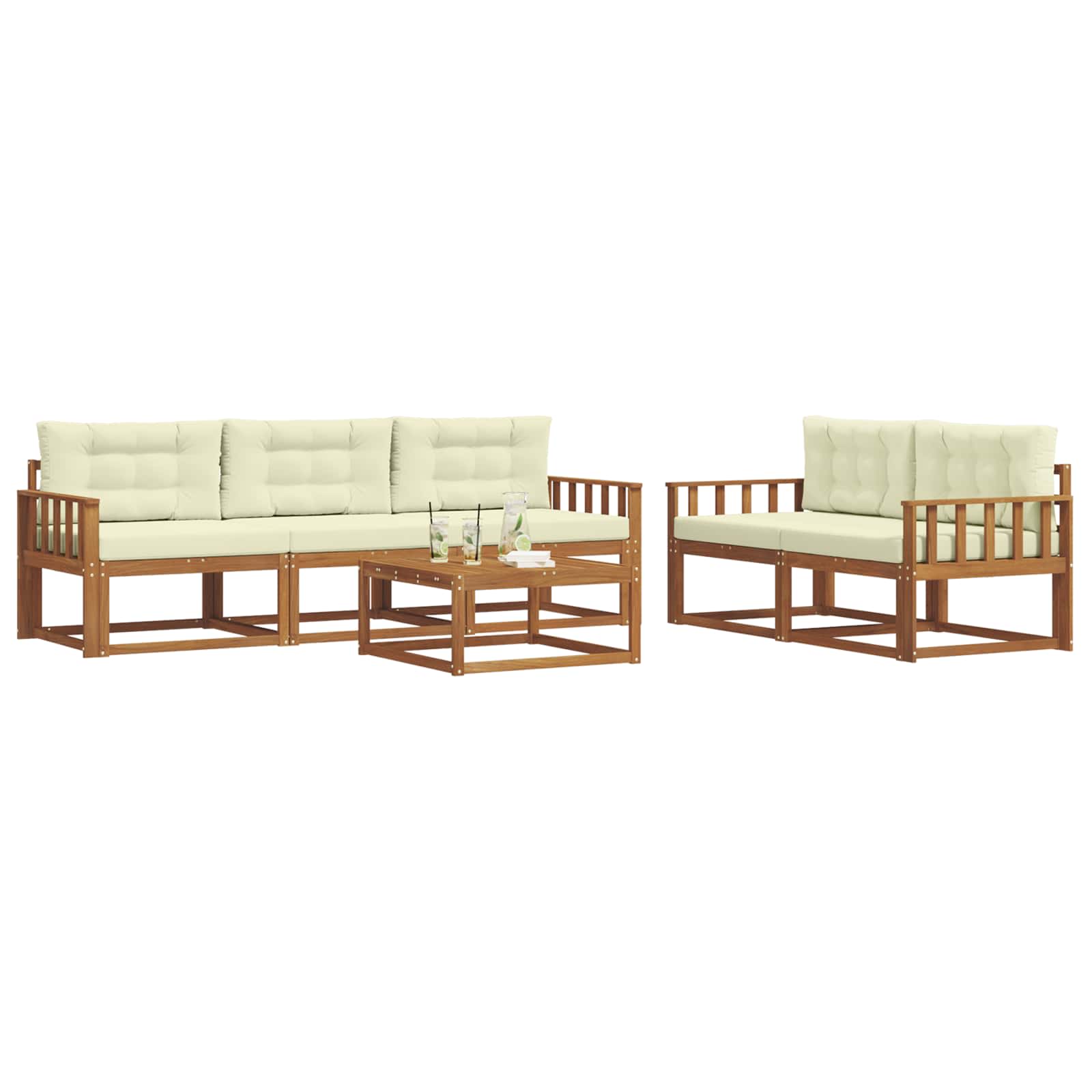 Ta eleganten set sofasetov je točno tisto, kar potrebujete za vaš vrt, teraso ali bazen. Moderno zasnovan, združuje stil in funkcionalnost, njegove tople rjave barve in letvasta hrbtišča prinašajo pridih luksuza, ter ustvarjajo udoben prostor za druženje ali sproščanje. Ne glede na to, ali ste pod streho ali na soncu, ta set prinaša brezčasen šarm in prilagodljivost, kar vabi vse, da uživajo v zunanjih trenutkih. Trden akacijev les: Ta sofaset je narejen iz vrhunskega trdega akacijevega lesa, kar zagotavlja naravno lepoto in trpežnost. Akacija je znana po svoji odpornosti na vreme in obrabo, kar podaljšuje življenjsko dobo pohištva. Lesena struktura je enostavna za vzdrževanje in idealna za moderne uporabnike. Letvasta zasnova: Z elegantno letvasto zasnovo, ta sofaset prinaša funkcionalnost in zračnost. Ergonomična podpora za hrbet nudi udobje, estetska zasnova pa izboljšuje zunanje površine, kar ustvarja prijetna mesta za druženje ali sprostitev. Fiksni letvičasti okvir: Z močno, fiksno zasnovo okvirja, ta sofaset zagotavlja stabilnost in zanesljivost. Idealna izbira za zunanje prostore, konstrukcija pa doda estetsko vrednost, ki poudarja tako trpežnost kot šik izgled. Lastnost odporna na vreme: Zasnovan za zunanjo uporabo, ta set je odporen na različne vremenske pogoje. Od sončnega vremena do vetrovnih večerov, materiali in zasnova zaščitijo pohištvo, da ostane udobno skozi vse leto. Modularna konfiguracija: Ta sofaset vam omogoča, da prilagodite svoje sedežne postavitve, kar je super za različne priložnosti. Ustvarite intime skupine ali širša ležišča, kar se enostavno prilagaja vašim potrebam. Njegova vsestranskost povečuje uporabnost in omogoča prilagoditev prostora po želji.