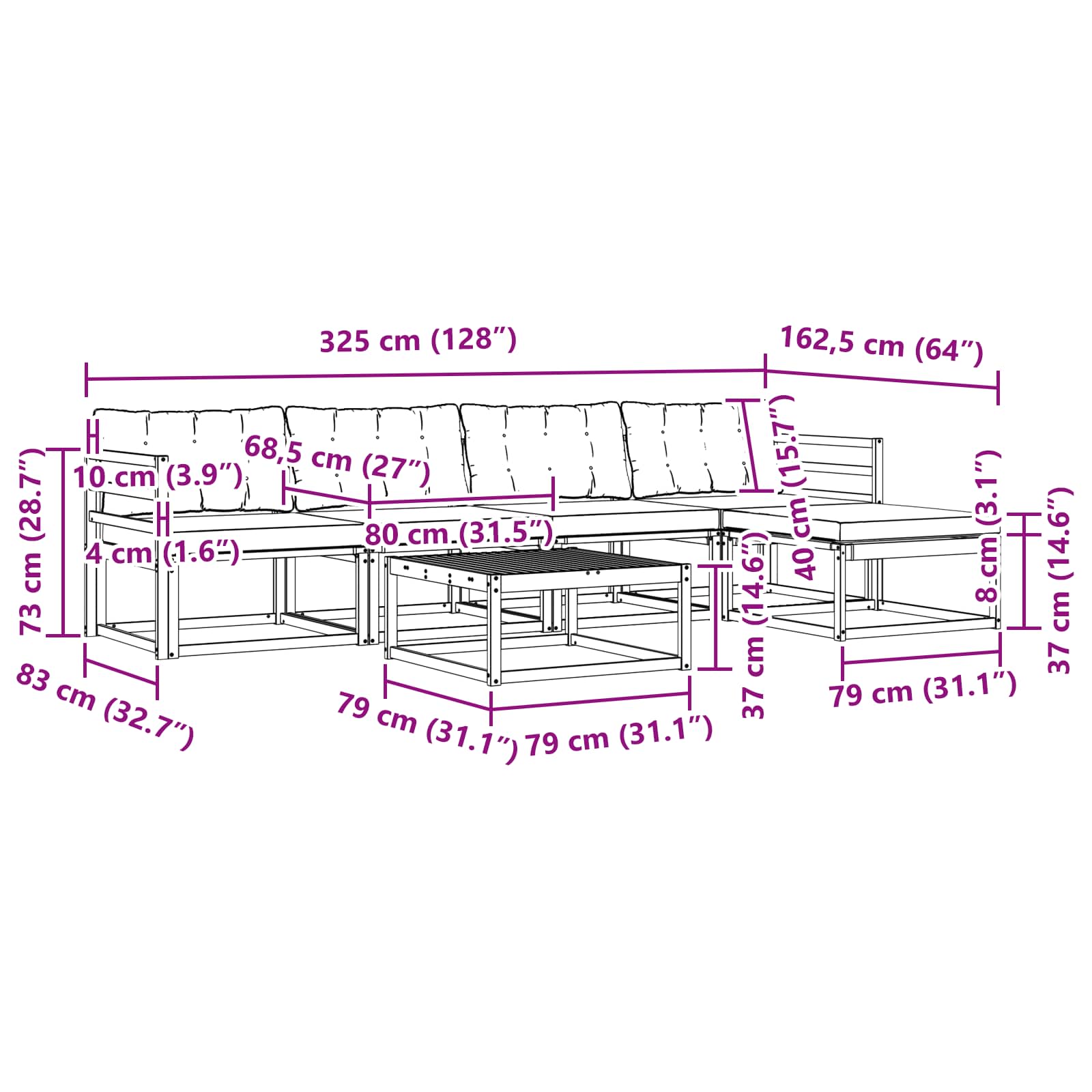 - 4 x Srednji kavč: 79 x 83 x 73 cm (DxŠxV)