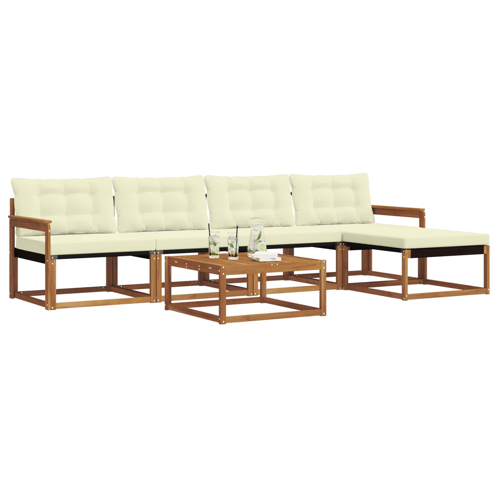 Ta sodoben kavč bo dvignil vaš vrt ali teraso. Minimalistično oblikovanje in robustna funkcionalnost se lepo združita, kar je idealno za vse, ki cenijo preprostost in naravne elemente. Nudi umirjen pobeg na prostem in ima dovolj prostora za sedenje, kar je super za druženja ali tihe trenutke razmišljanja. Premium materiali: Ta komplet je izdelan iz trdnega akacijevega lesa in tekstilena, kar pomeni dolgo življensko dobo in privlačnost. Topli naravni lesni ton in prejo tekstilena zagotavljata, da komplet ostaja eleganten in vzdržljiv v vašem zunanjem bivalnem prostoru. Vključene komponente: Ima praktične naslončke za roke iz trdnega akacijevega lesa, ki ponujajo udobje in stil. Set vsebuje tudi vremensko odporne zunanje blazine, ki so debelo podložene za udobno izkušnjo sedenja in naslon hrbta za sprostitev. Pametne funkcije: Modularna gradnja pomeni, da lahko preuredite kavč, da ustreza vašim potrebam. Površina je odporna na bledenje, kar olajša vzdrževanje, medtem ko naslončki izboljšujejo udobje. Vsestranska uporaba: Odlično za zunanje prostore, kot so terase in vrtovi. Prilagodljiva razporeditev omogoča različne namene, od počivanja do družabnih srečanj. Oprema in vzdrževanje: Enostavno vzdrževanje z preprostimi navodili – samo uporabite vlažno krpo za čiščenje. Odstranljive blazine z zadrgo omogočajo enostavno čiščenje in svežino.