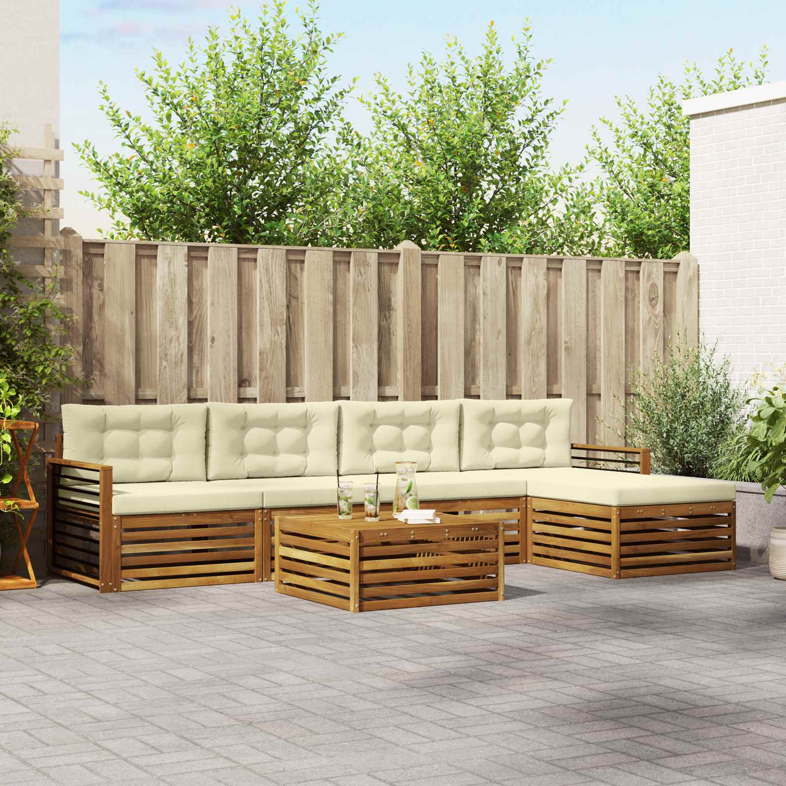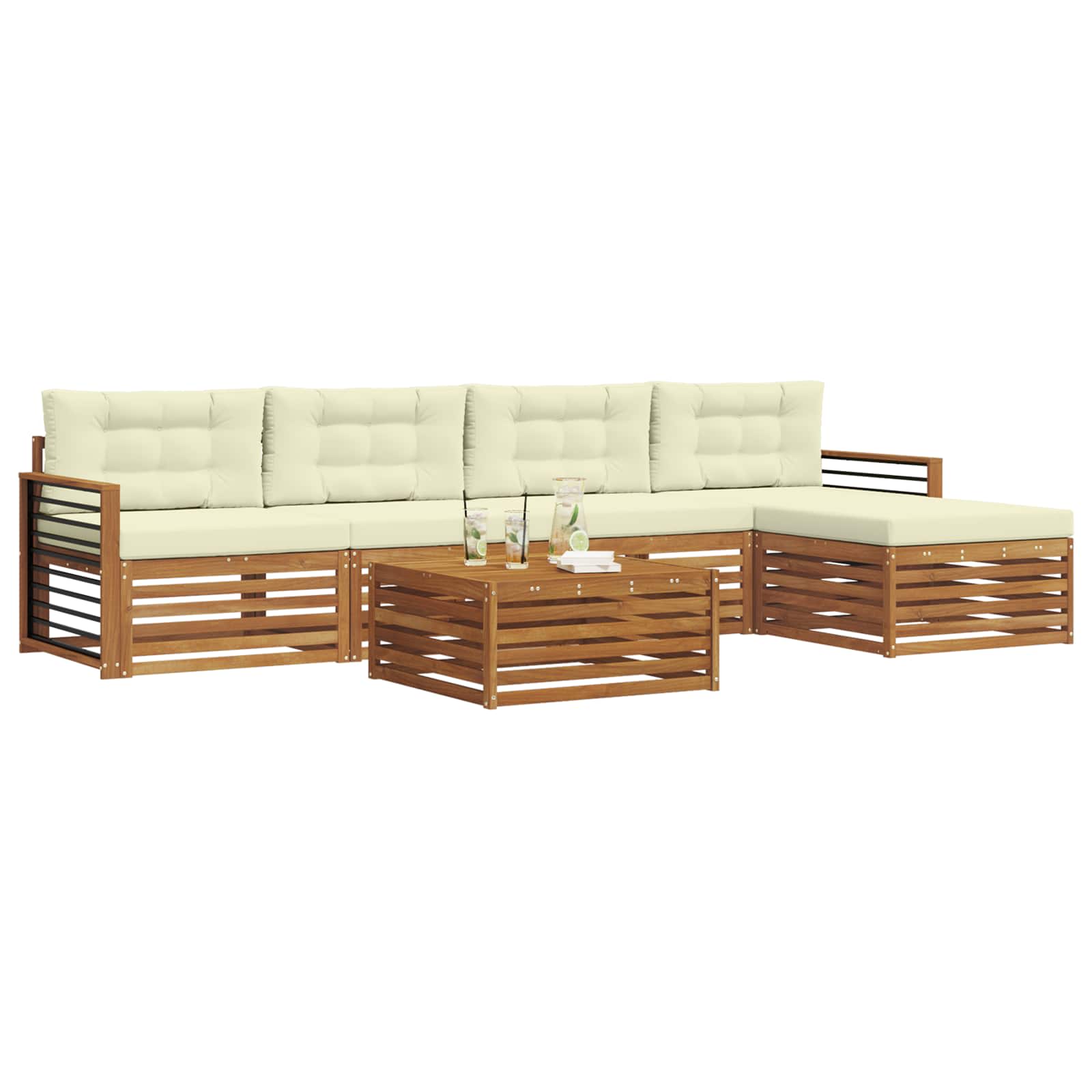 Ta zunanja garnitura povezuje stil in funkcionalnost ter ustvari izjemen center za vaš vrt ali teraso. S sodobnim dizajnom in čistimi linijami dodaja eleganco, obenem pa nudi podporo za sproščanje in druženje. Narejena iz trdnega akacijevega lesa, zagotavlja dolgotrajnost in lep videz – odlična izbira za vse, ki iščejo funkcionalno in estetsko zunanje pohištvo. Vzdržljiv trden akacijev les: Ta zunanji pohištvo iz trdnega akacijevega lesa je zelo vzdržljivo in odporno na vreme. Njegova stabilna konstrukcija zagotavlja dolgo življenjsko dobo, medtem ko topla barva doda čar vsakemu vrtu ali terasi. Oblikovanje odporne na vreme: Ta set zunanji pohištva ima polirano površino, ki dodatno ščiti pred soncem, rahlim dežjem in drugimi zunanjimi elementi. Poliran zaključek pomaga ohranjati videz in delovanje ter zagotavlja dolgo življenjsko dobo za vaš vrt, teraso ali dvorišče. Komponente in oblikovanje: Vsak del garniture, od naslonjal do naslonjal za roke, združuje stil in funkcionalnost. Podporne lastnosti zagotavljajo dodatno udobje, medtem ko koherentno oblikovanje ustvari vizualno privlačen sklop, primeren za vse zunanje priložnosti. Udobje in vsestranskost: Modularna zasnova omogoča prilagodljive postavitve, ki ustrezajo različnim prostorom in potrebam. Ta garnitura je odlična za sprostitev, zabave ali tihe trenutke branja in se enostavno prilagaja vsakemu zunanjemu okolju ter maksimira udobje in uporabnost. Enostavno vzdrževanje: Da pohištvo ostane v dobrem stanju, obrišite površino z vlažno krpo in se izogibajte ostrim ali abrazivnim čistilom. Redno vzdrževanje podaljša življenjsko dobo in ohrani videz pohištva.