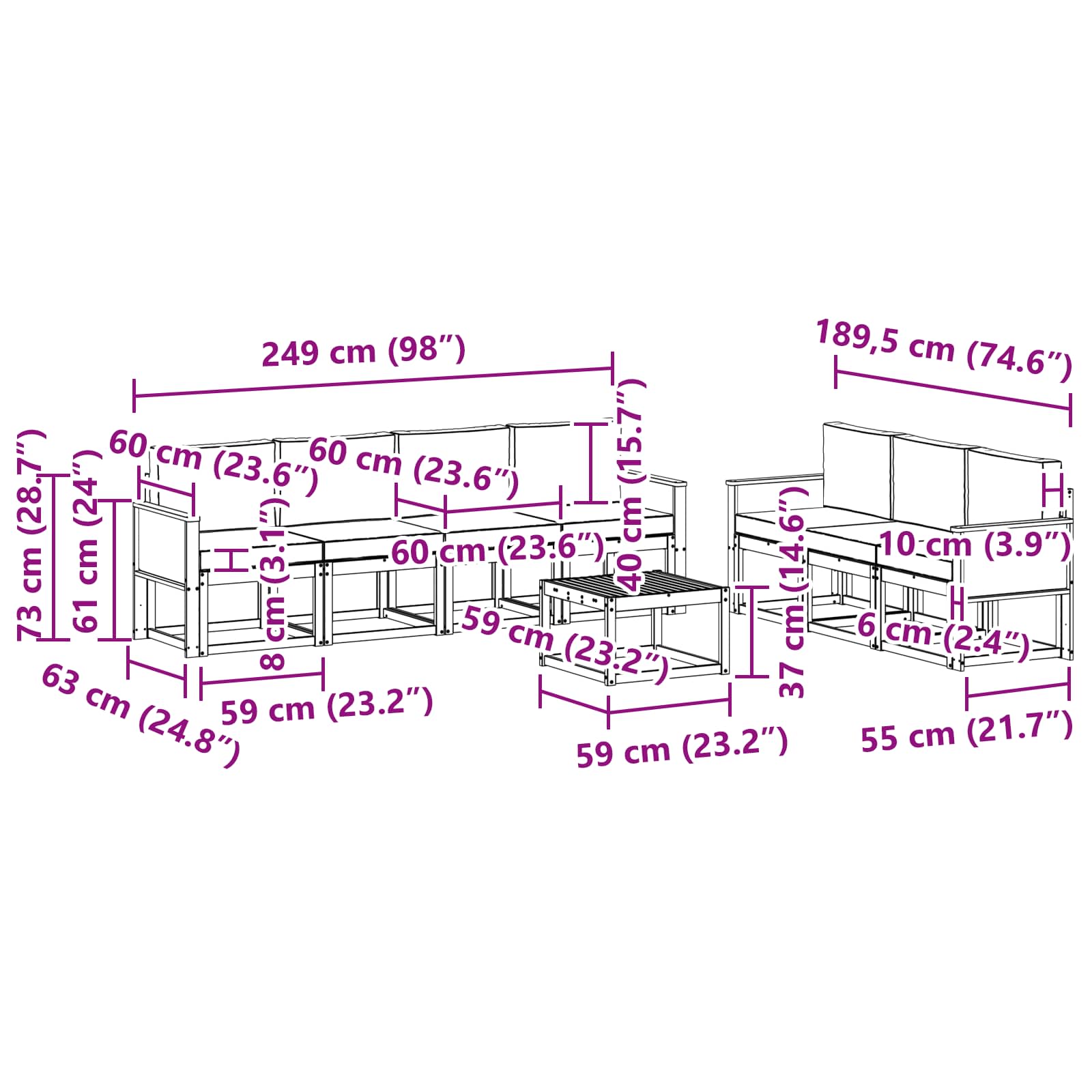 - 7 x sedežna blazina: 60 x 60 x 8 cm (D x Š x V)