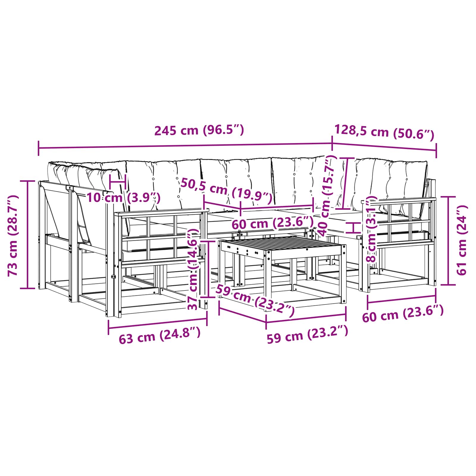 - 8 x Nazadnja blazina: 60 x 40 x 10 cm (DxŠxV)