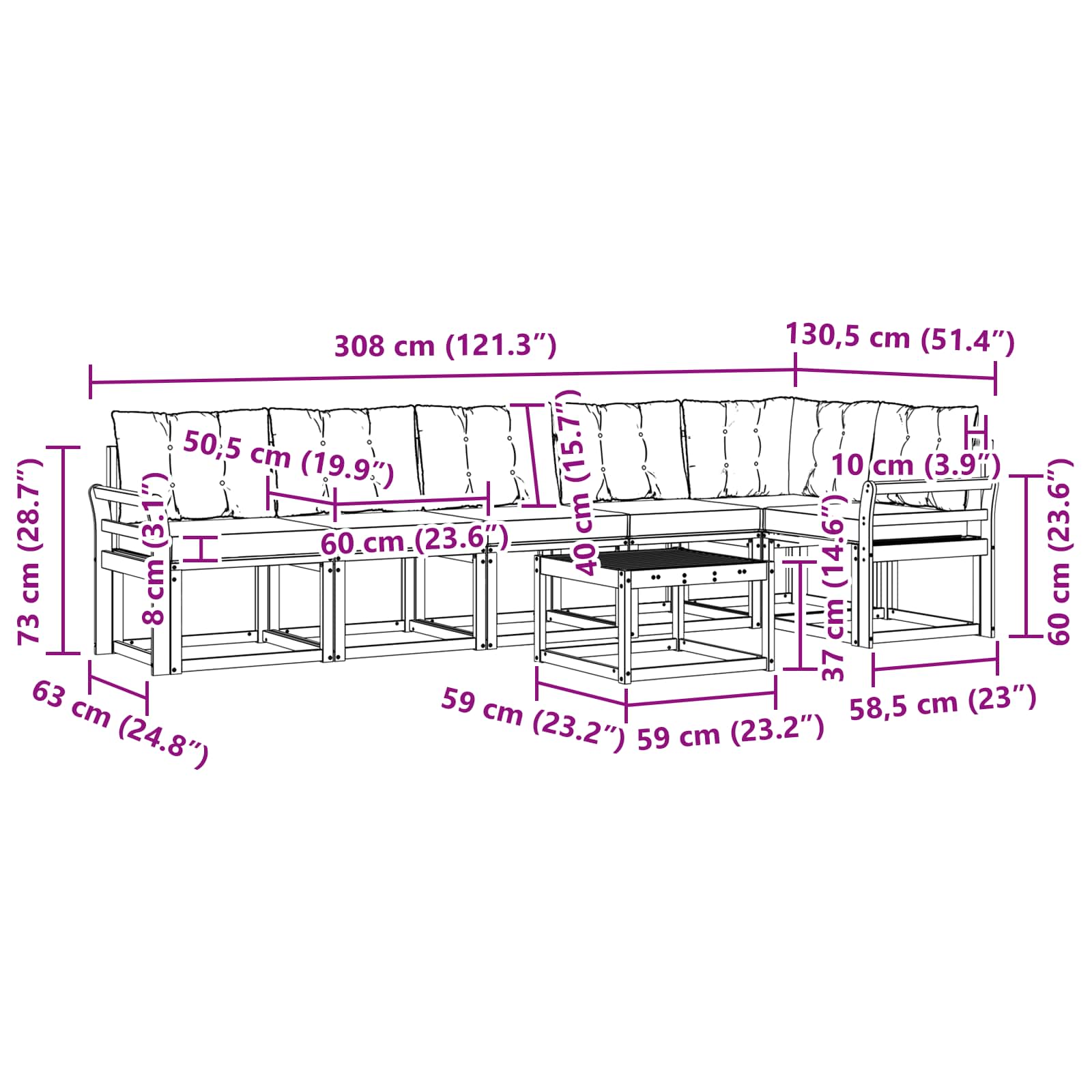 - 7 x Hrbtna Blazina: 60 x 40 x 10 cm (D x Š x V)