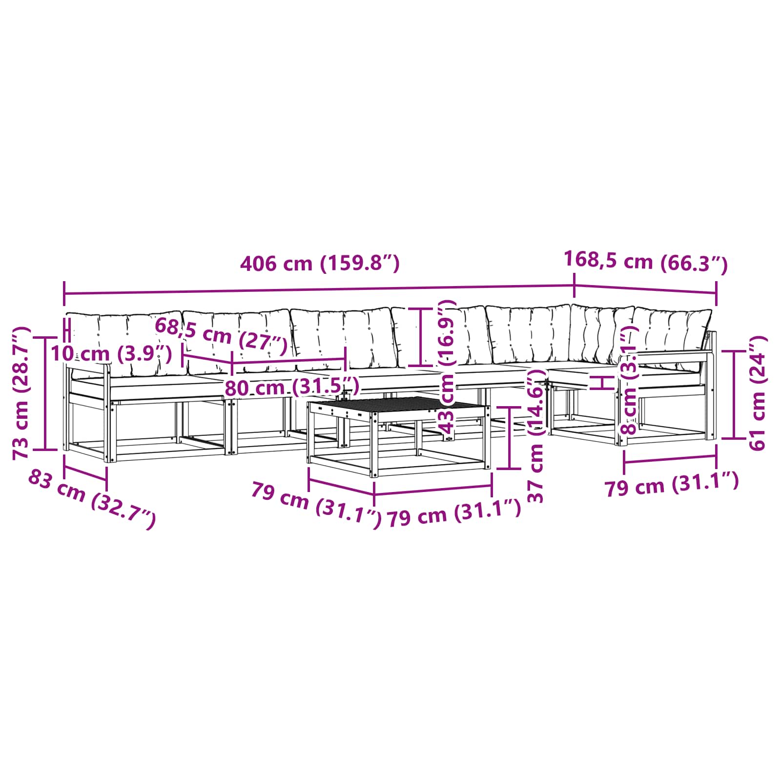 - 5 x Srednji kavč: 79 x 83 x 73 cm (D x Š x V)