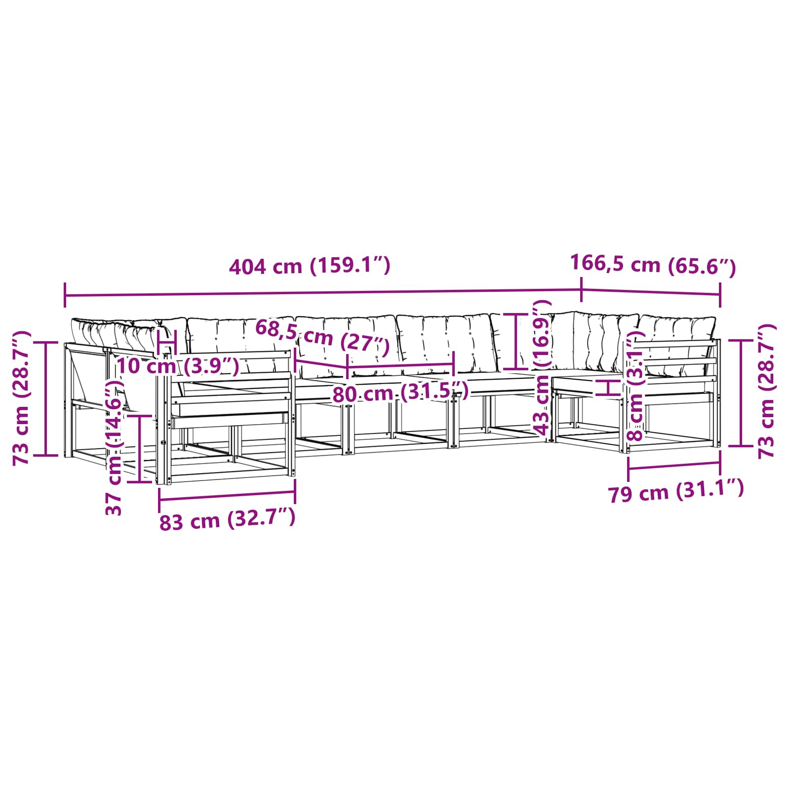 - 5 x sedežna blazina: 80 x 68,5 x 8 cm (D x Š x V)