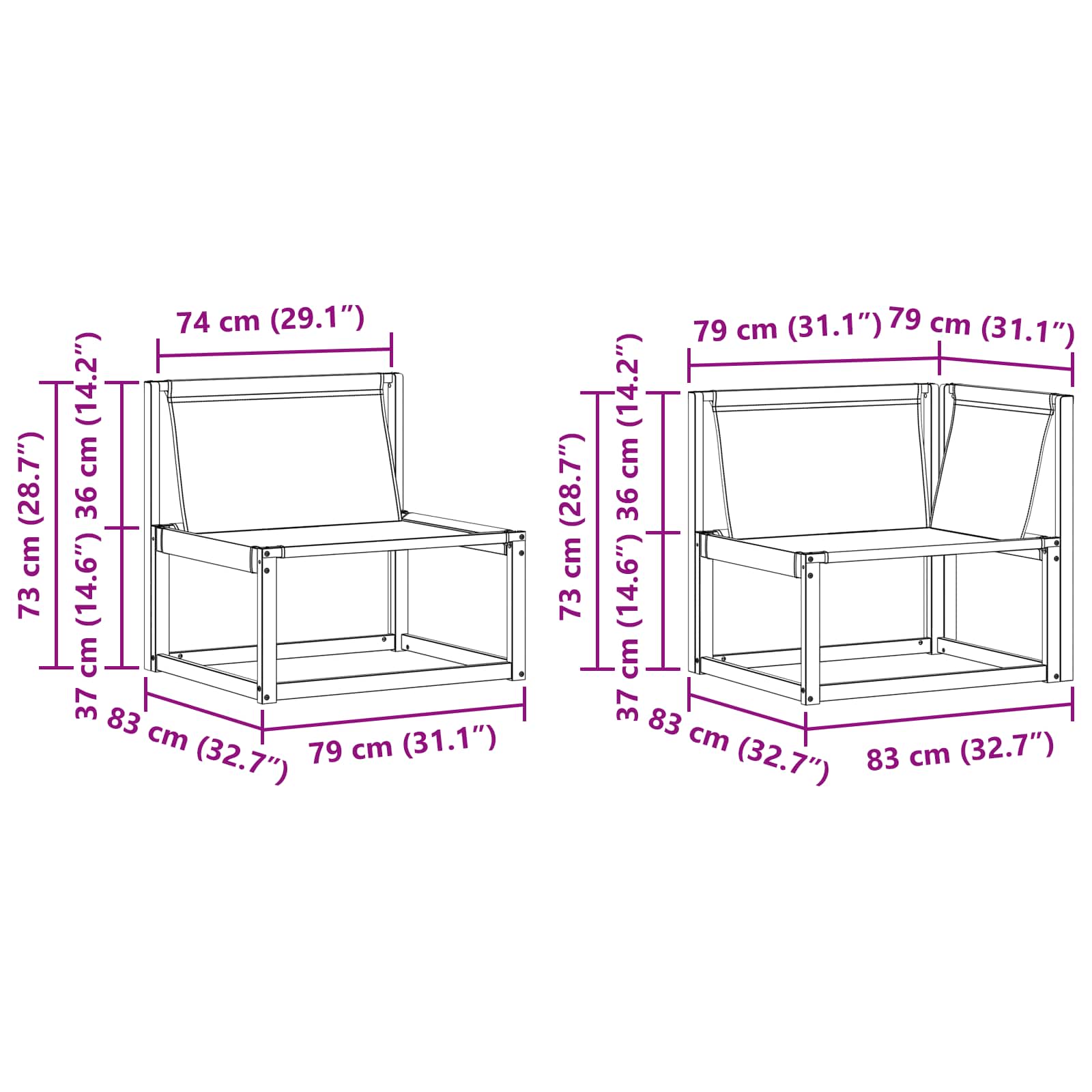 - 5 x Srednji kavč: 79 x 83 x 73 cm (D x Š x V)