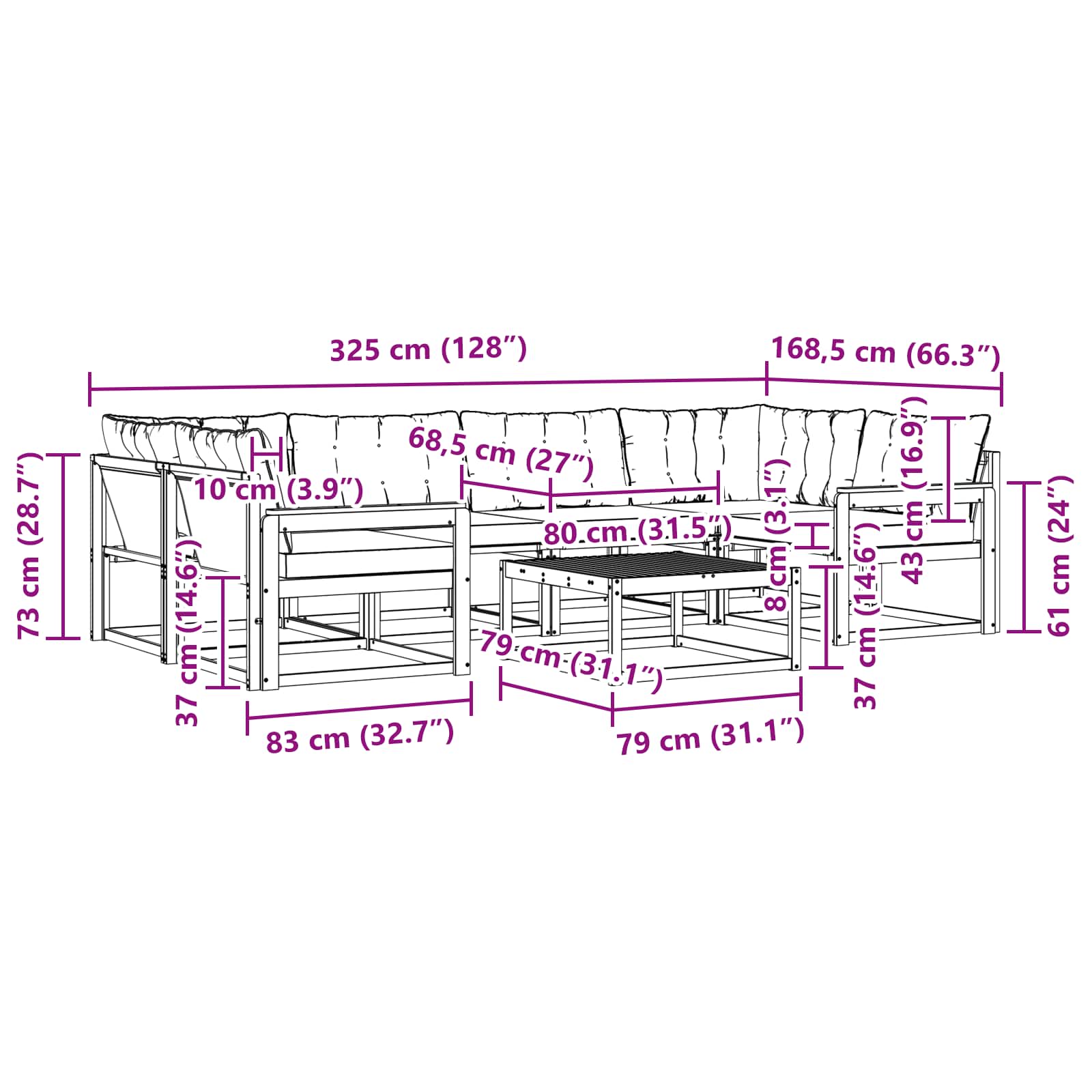 - 4 x Srednji kavč: 79 x 83 x 73 cm (DxŠxV)