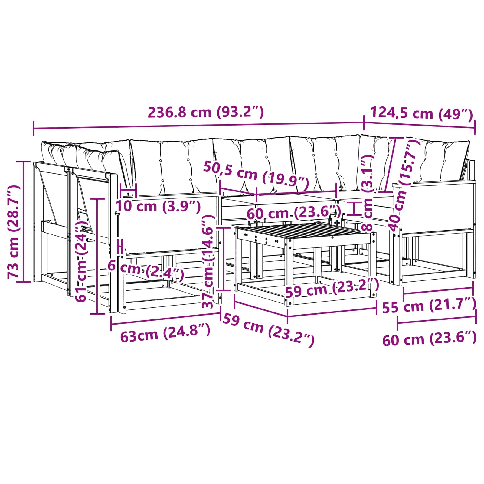 - 4 x Srednji Kavč: 59 x 63 x 73 cm (D x Š x V)