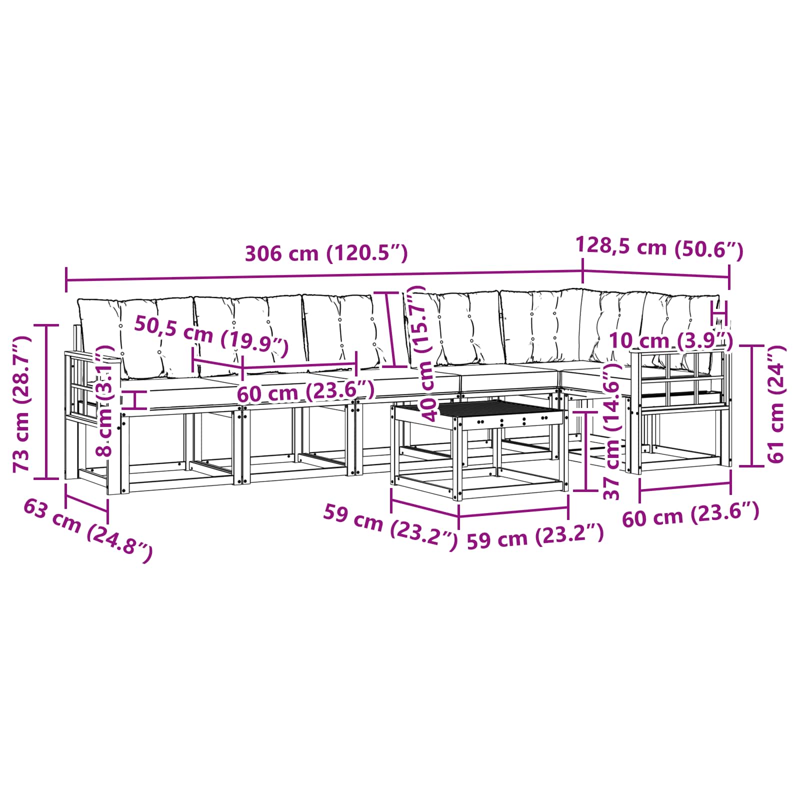 - 5 x Srednja Sofa: 59 x 63 x 73 cm (D x Š x V)