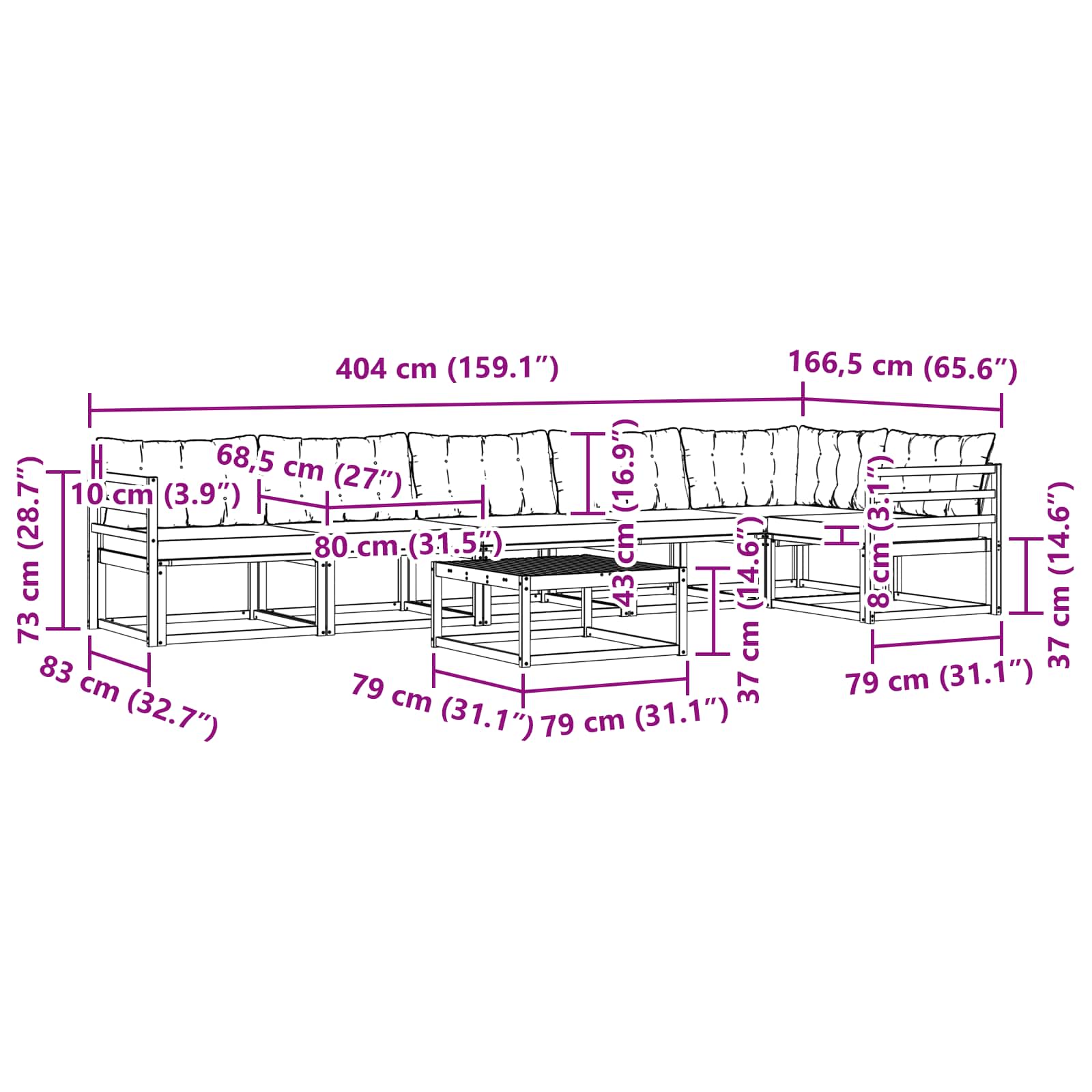 - 5 x Srednji kavč: 79 x 83 x 73 cm (D x Š x V)